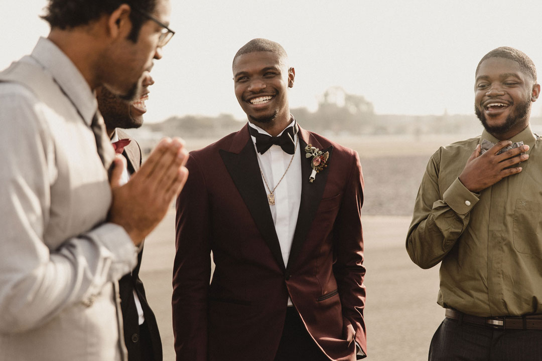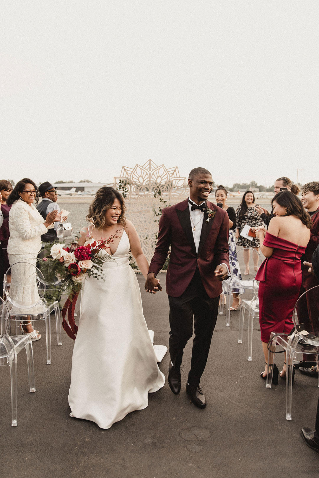 Venue: Hangar 21 // Catering and Bar: Jay’s Catering // Event Coordination: Candace Jolee Events // Photographer: Alivia Latimer // Florist: Rogue & Fox // MUA: Girl Meets Bongga // Dress: BHLDN tailored by The Williamsburg Seamster // Tux: Suit Supply // Photo Booth: The Booth & Bus Co. // DJ: VOX DJs