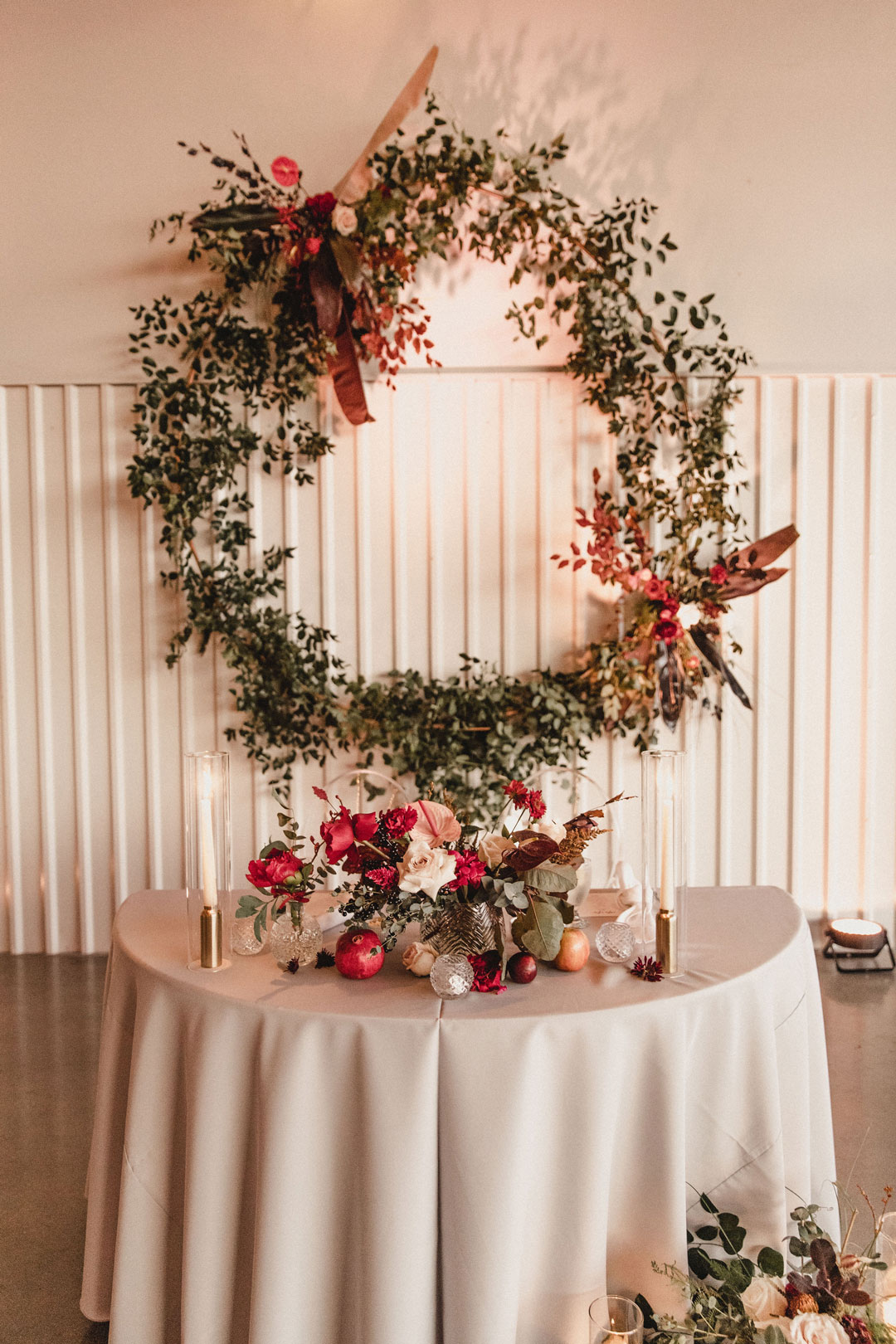 Memories were made and captured during cocktail hour inside The Booth and Bus Co. photo bus as guests were ushered into the venue. Individual tables were sophisticatedly simplified with leafy garland and a few flowers while the sweetheart was decorated wish candles, assorted vases filled with lilies, roses and greens, pomegranates and apples.