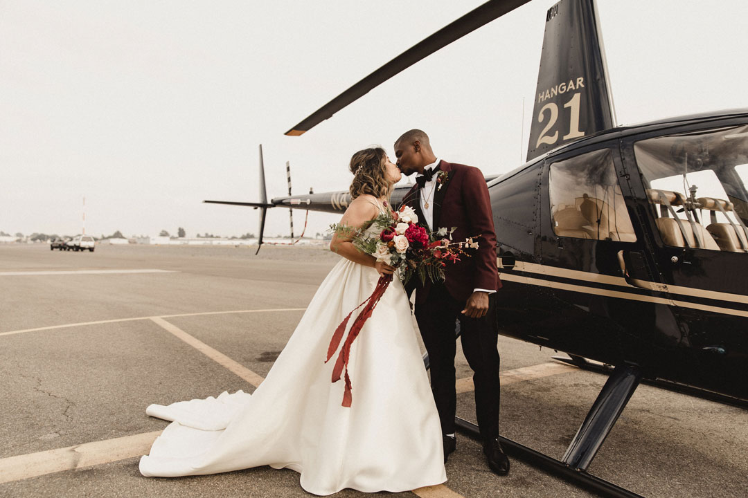 Jemimah and Jonathan’s wedding and reception at Hangar 21 was a stylish soiree from their fashionable looks to the decor. The couple recited their vows in front of family, friends, and a beautifully crafted wooden ceremony backdrop. Afterwards, they waved goodbye and off they went on their helicopter ride as guests enjoyed light hor d’oeuvres and refreshment.