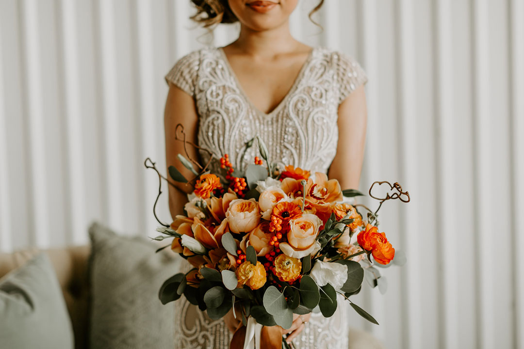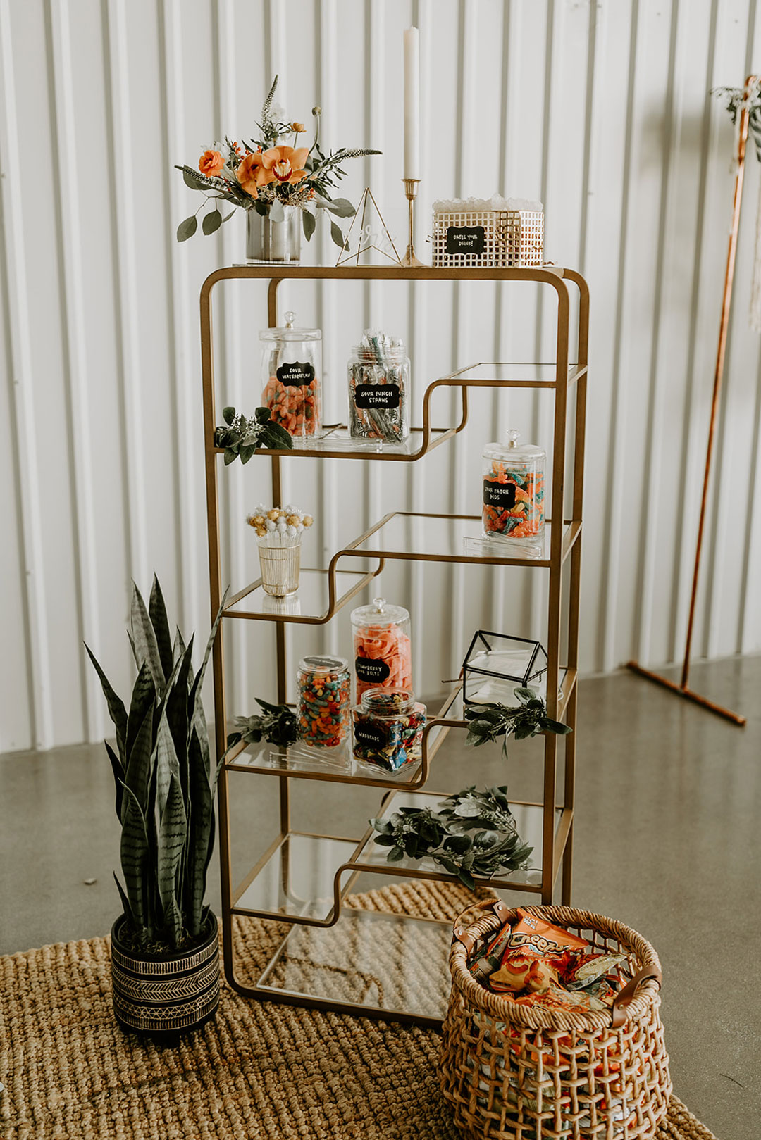 Orange and peach roses, orchids, and ranunculus were the star of the show on each tabletop while the sweetheart table was decorated in tall orange candles, eucalyptus garland, and a macramé backdrop. The seating chart was travel inspired and mimicked an airport flight arrival board. Delectable bites like Warm Monterey Jack Cheese with Chorizo and Fresh Mushroom with Jay’s Famous Tortilla Chips and Basil Cream Cheese Torte with Crackers were ready to be devoured for cocktail hour along with his and hers specialty craft cocktails.