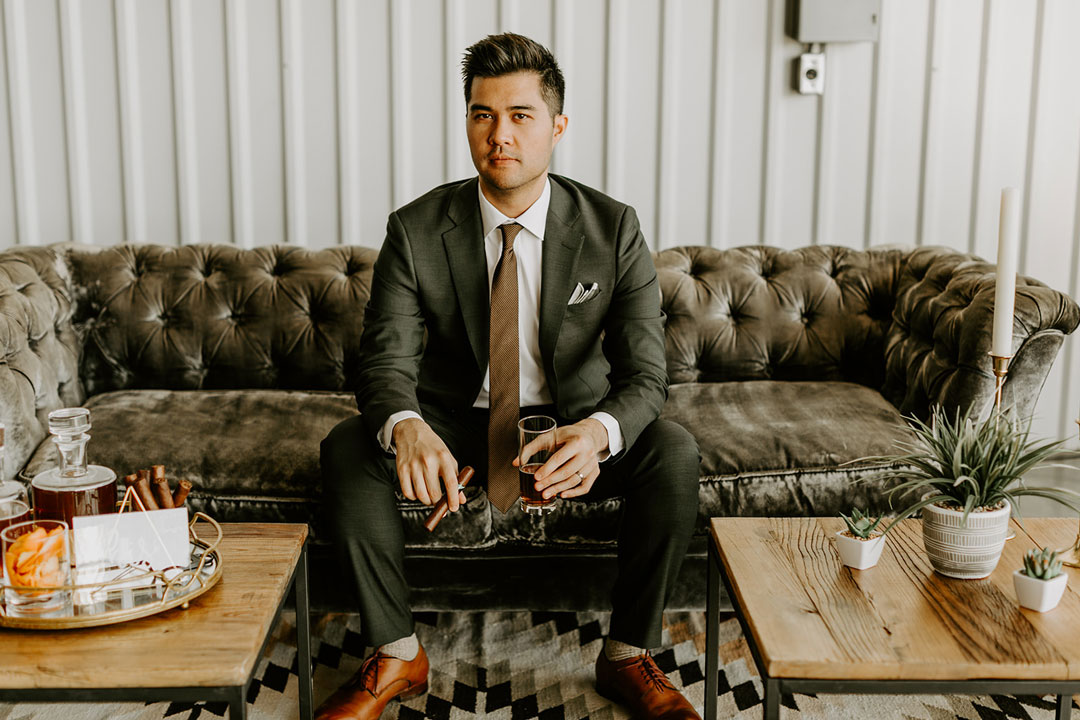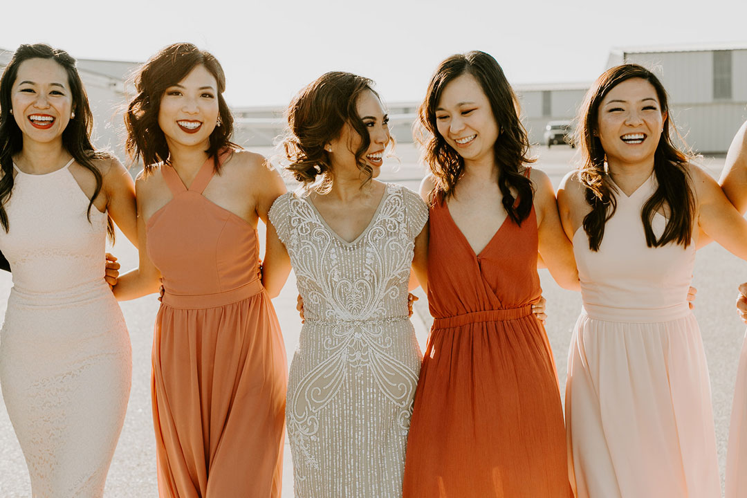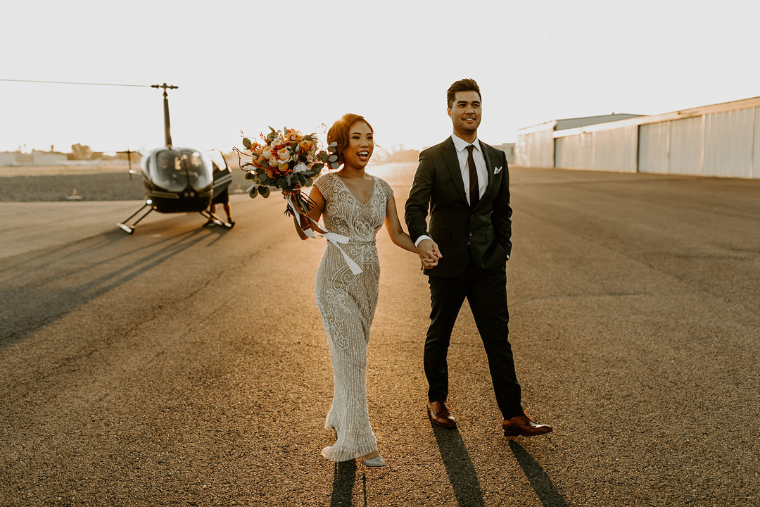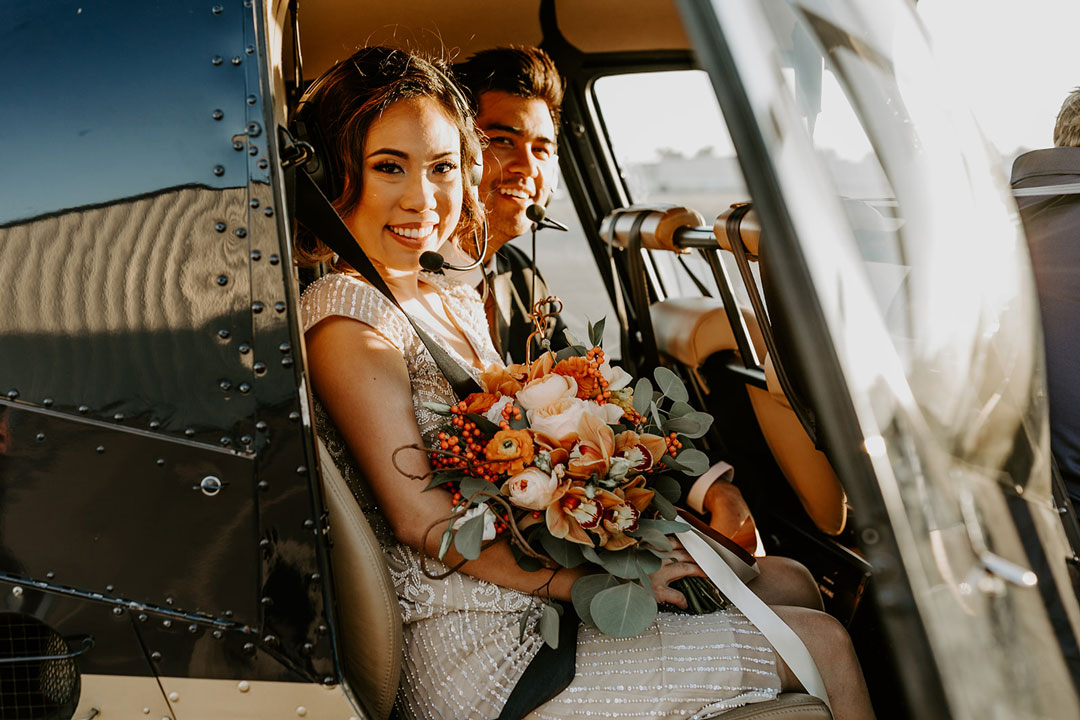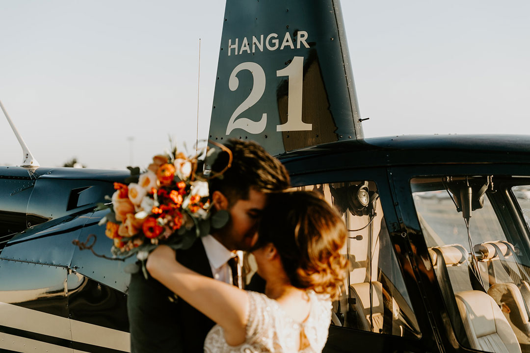 I dos were exchanged and now it was time to let loose and have a good time with family and friends. Stella and Michael, along with their wedding party, snacked on sweet and salty treats, sipped on cocktails, and sat back with a cigar while everyone was making their way over to Hangar 21. Before the reception could commence, the bride and groom hopped on a helicopter ride for their grand entrance.