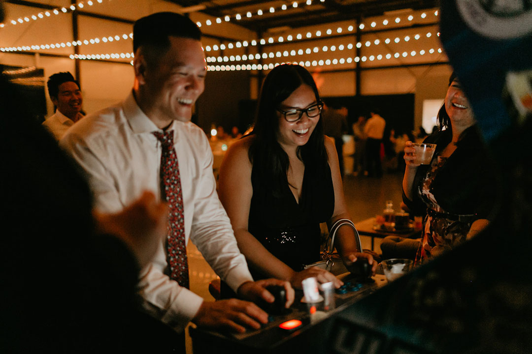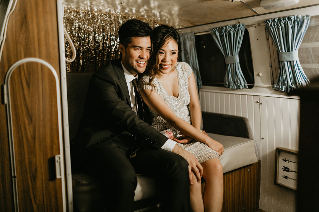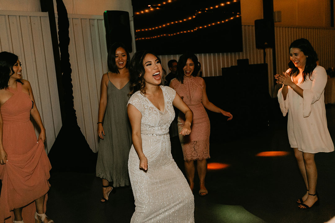 The bride and groom touched down just in time for toasts and dinner. Mahi Mahi and Al Pastor Street Tacos with Handmade Corn and Flour Tortillas were on the menu along with Skewers and Freshly Baked Flatbread. Once everyone finished their meals, the evening was filled with arcade games, dancing, and picture taking inside a photo booth bus.