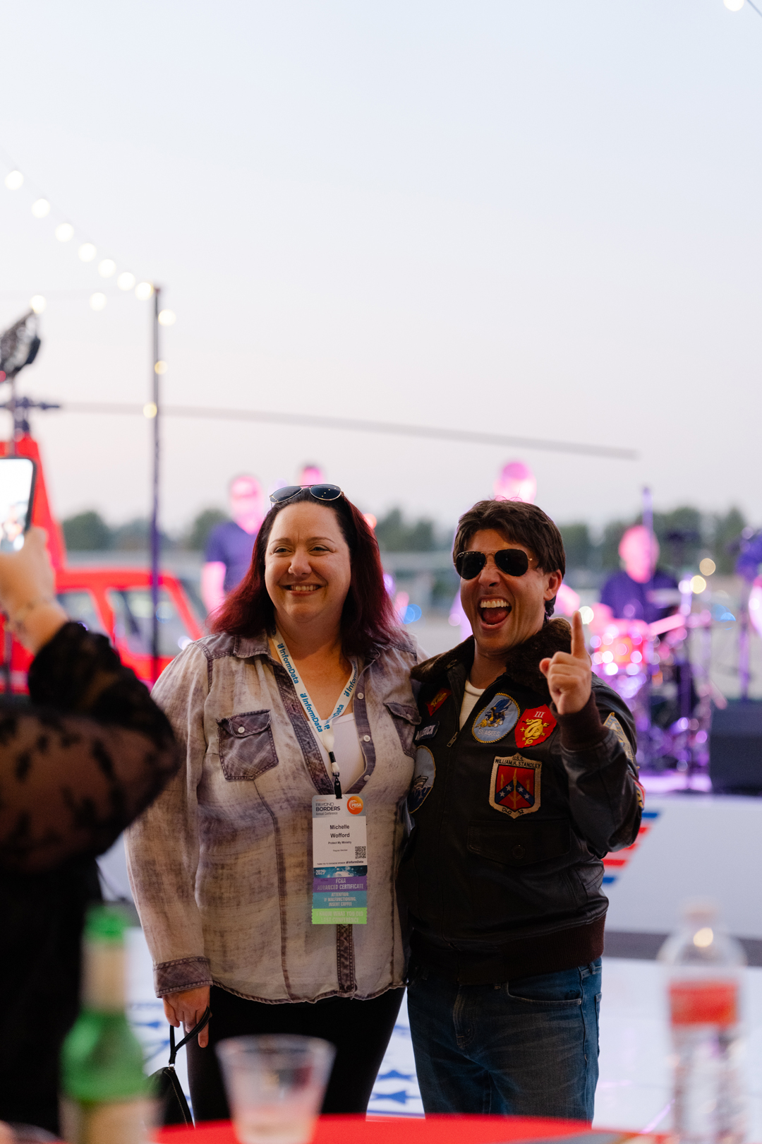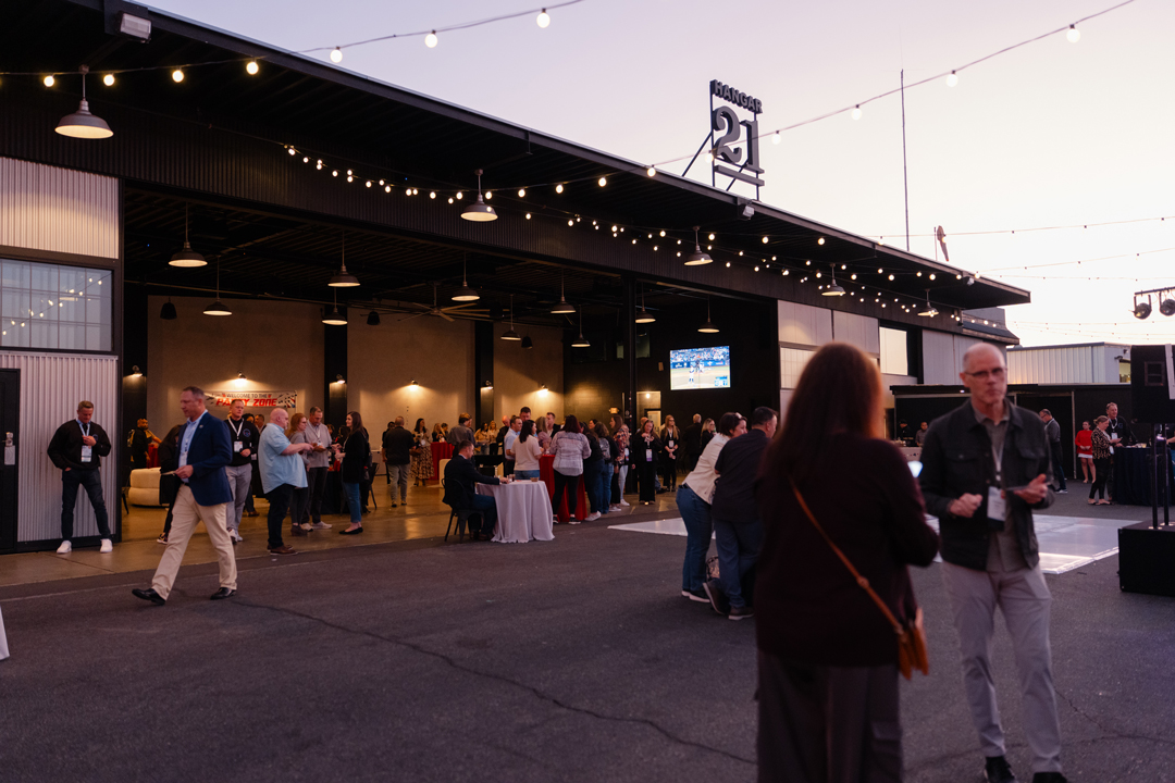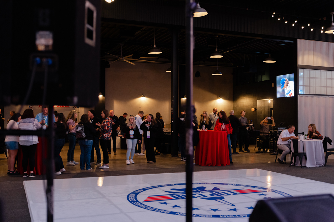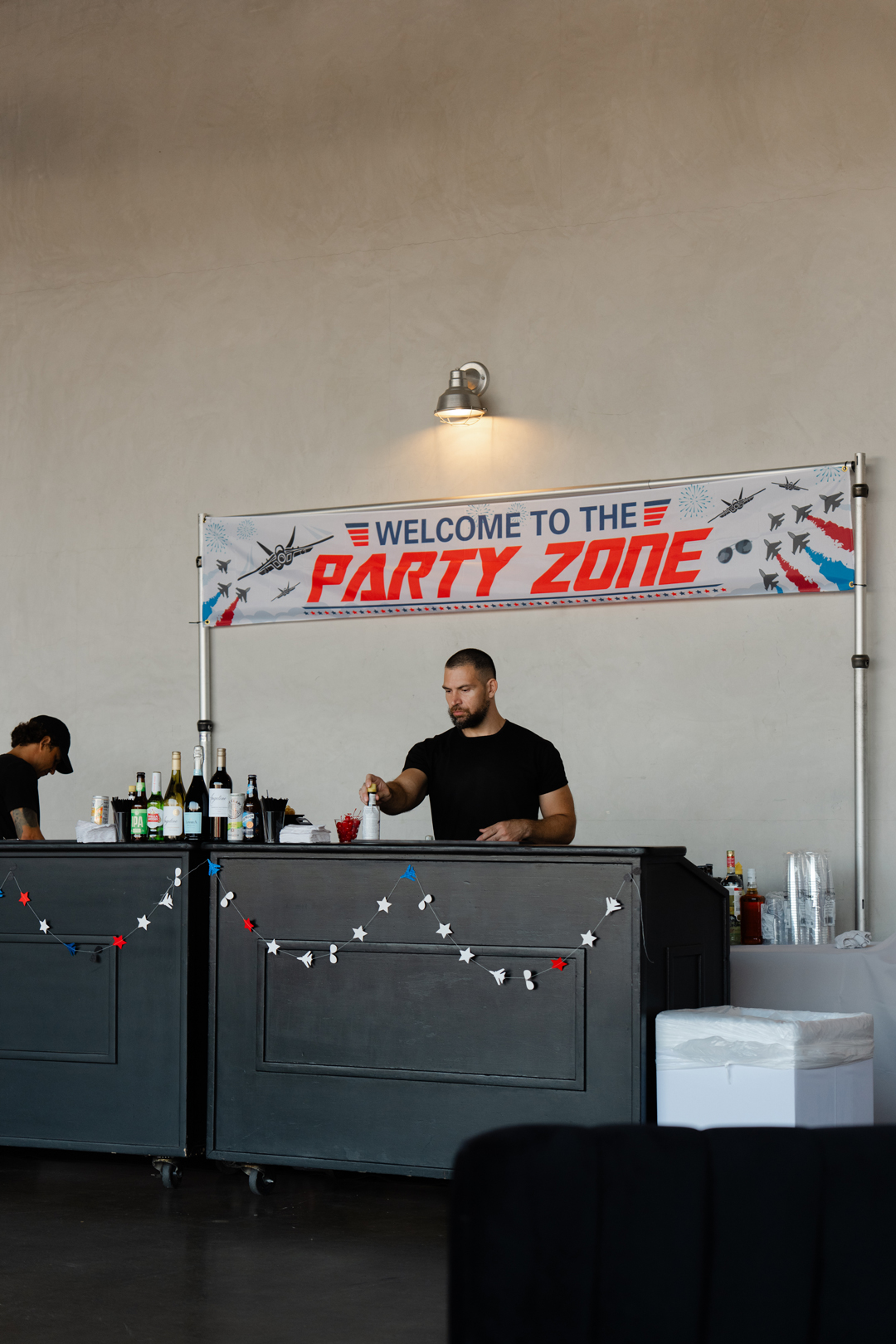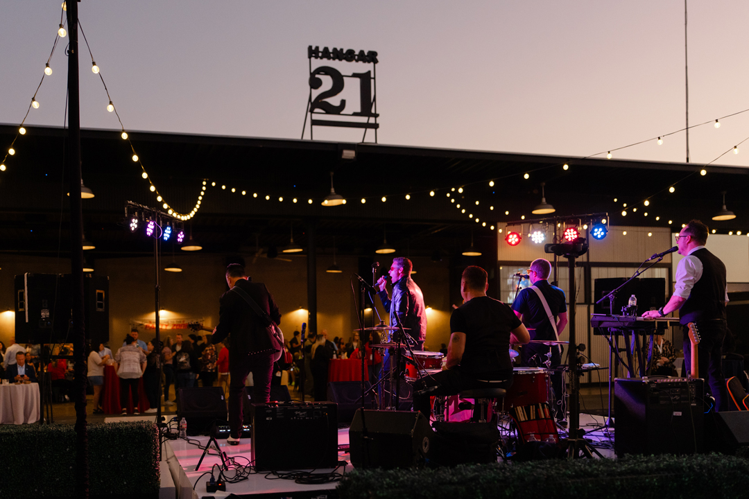 Red, white, and blue decorated Hangar 21 South for Background Service’s Top Gun themed kickoff party. A live band ushered guests into the space where they were greeted with Old Fashioned and Moscow Mule Signature Drinks and Mini Lobster Rolls, Filet and Wild Mushroom Wellingtons, and Sesame Shrimp and Mango Spring Rolls hors d’oeuvres. Ping pong, foosball, and other fun games were set on the side patio where guests mixed and mingled. Modern black and white lounges were placed inside the hangar for additional seating and firepits were sprinkled about outside. A guest appearance from a Top Gun Maverick impersonator had guests grabbing for their phones to pose for selfies. As the sun began to set, everyone was treated to our Pollo Asado and Carnitas Street Taco Station, Ahi Poke Station, Grilled Flatbread Station, and tray passed Chocolate Chip Cookies. The event menu was selected with help from our event specialist, Savannah. The evening came to a close with many connections made, excitement for the next day’s convention shared, and lots of dancing out on the dance floor.