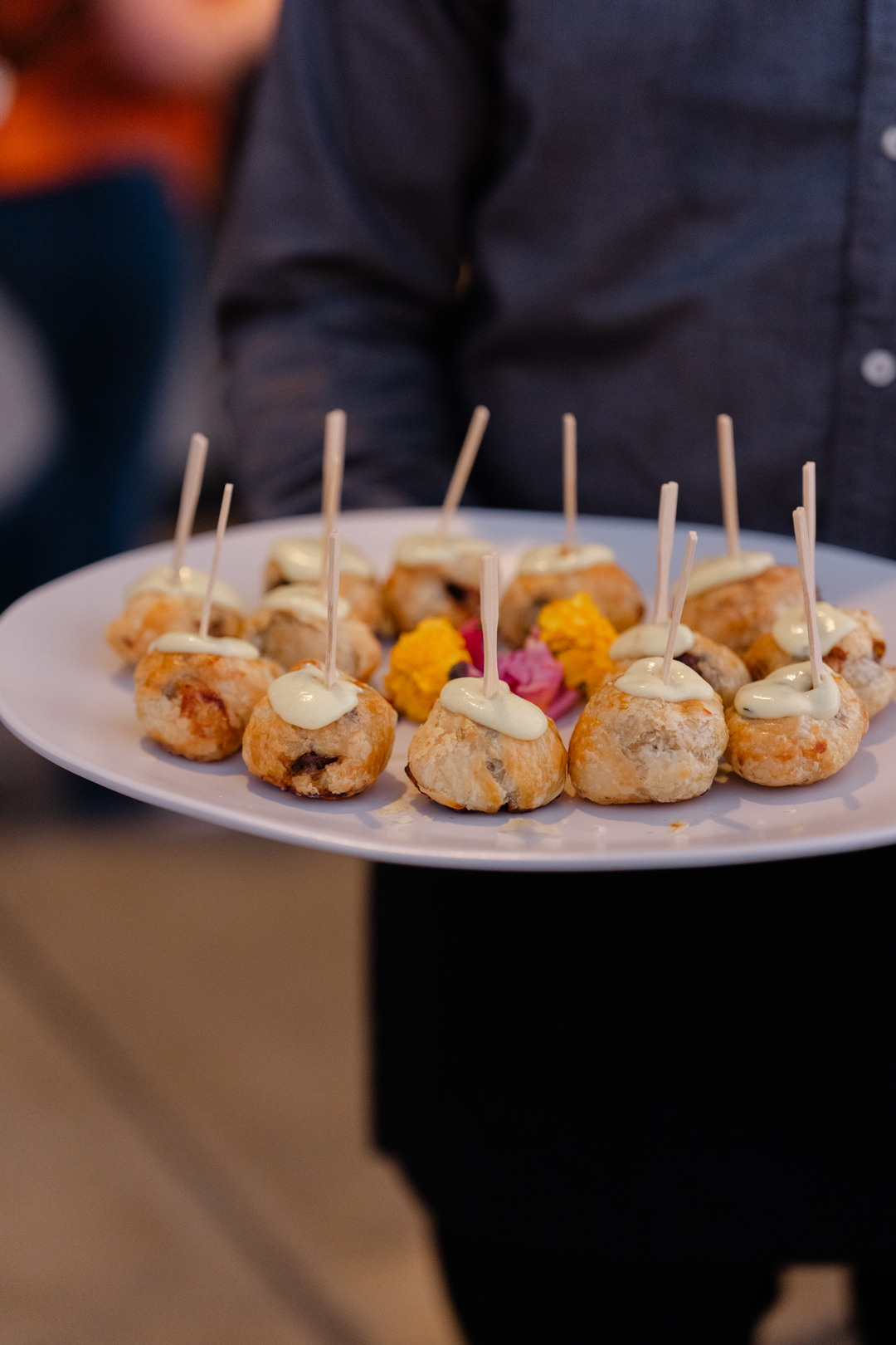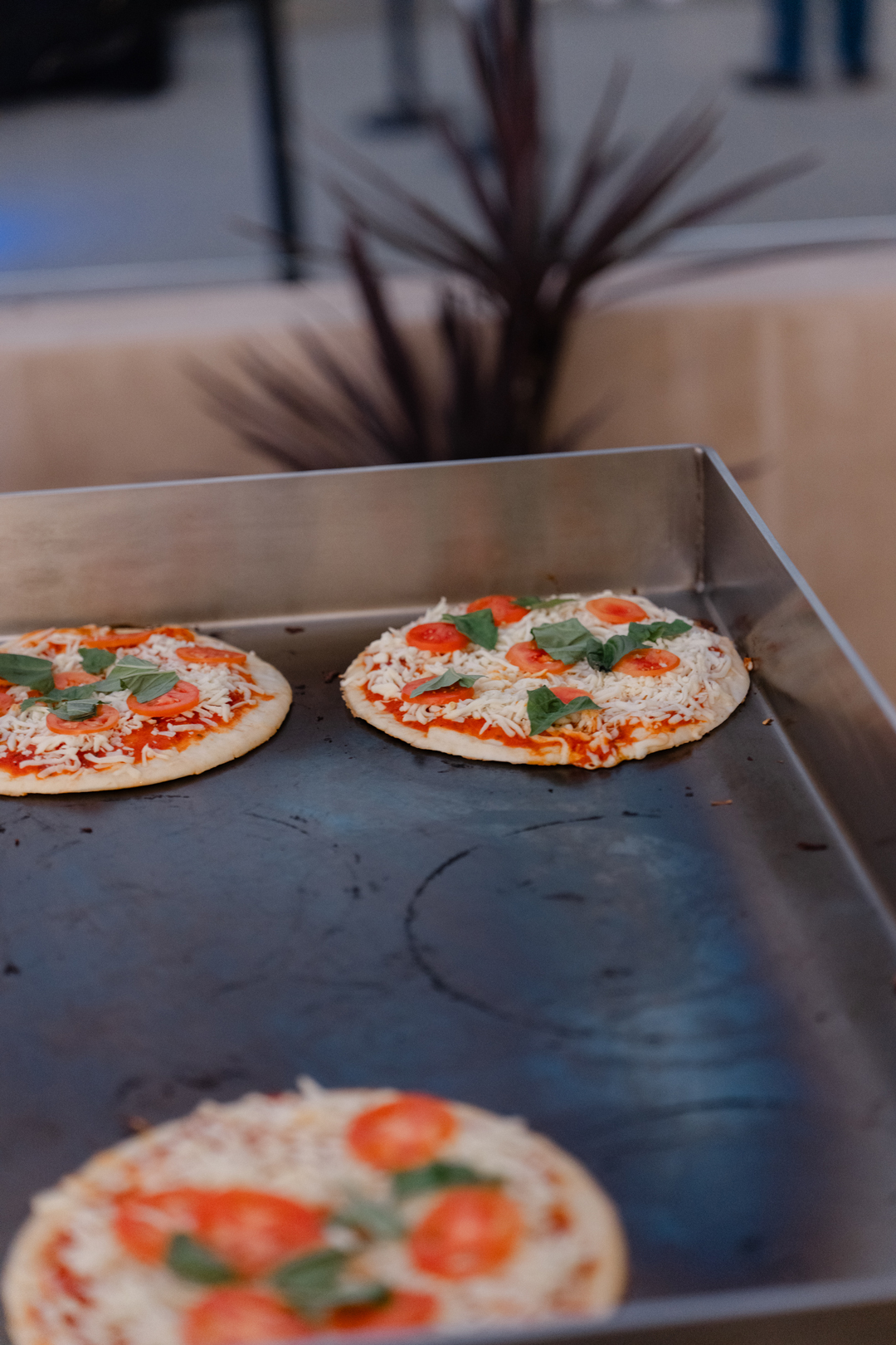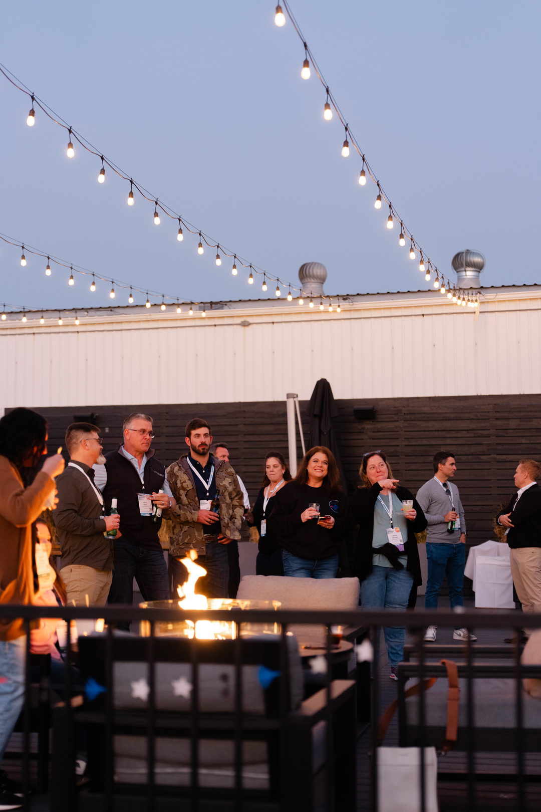 Red, white, and blue decorated Hangar 21 South for Background Service’s Top Gun themed kickoff party. A live band ushered guests into the space where they were greeted with Old Fashioned and Moscow Mule Signature Drinks and Mini Lobster Rolls, Filet and Wild Mushroom Wellingtons, and Sesame Shrimp and Mango Spring Rolls hors d’oeuvres. Ping pong, foosball, and other fun games were set on the side patio where guests mixed and mingled. Modern black and white lounges were placed inside the hangar for additional seating and firepits were sprinkled about outside. A guest appearance from a Top Gun Maverick impersonator had guests grabbing for their phones to pose for selfies. As the sun began to set, everyone was treated to our Pollo Asado and Carnitas Street Taco Station, Ahi Poke Station, Grilled Flatbread Station, and tray passed Chocolate Chip Cookies. The event menu was selected with help from our event specialist, Savannah. The evening came to a close with many connections made, excitement for the next day’s convention shared, and lots of dancing out on the dance floor.