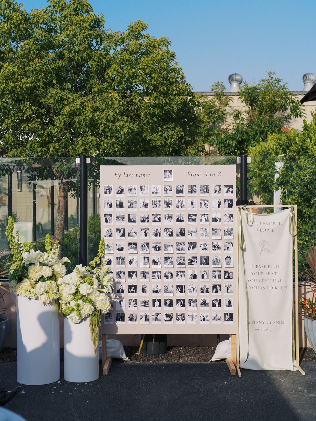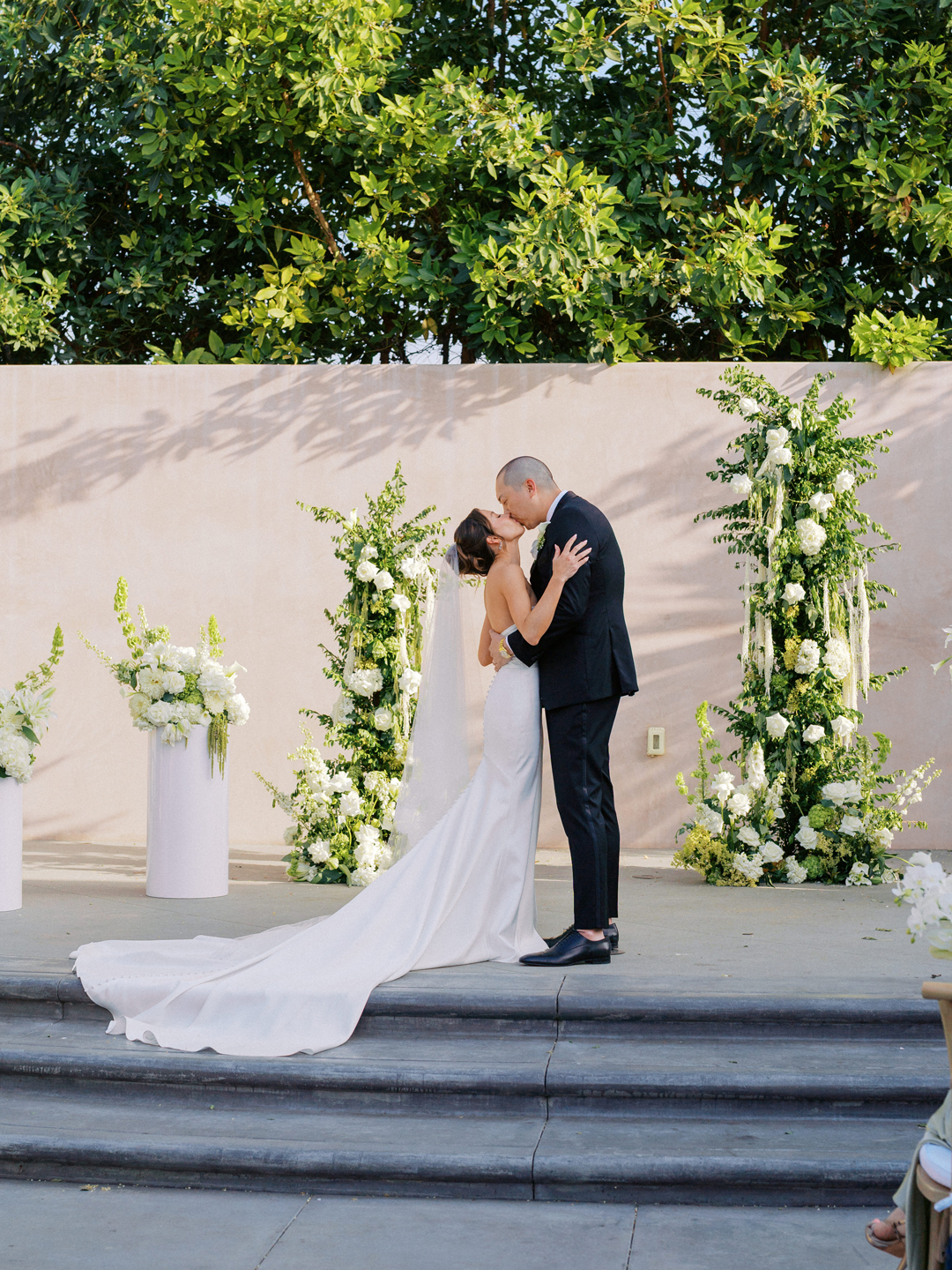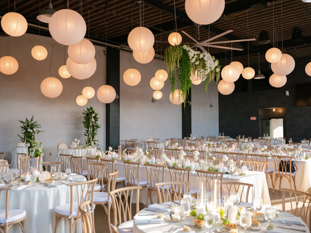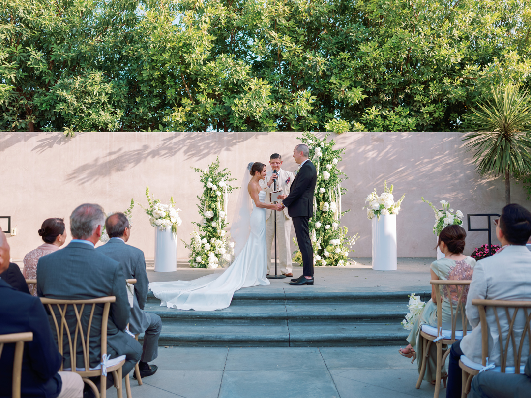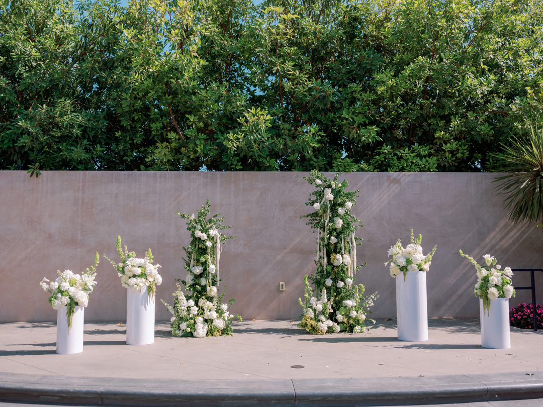 Guests entered the Hangar 21 South side patio, signed Brittany and Daniel’s guest book, then took a seat in wooden chairs. White floral and greenery pillars stood tall on the stage framed in by white pedestals topped with matching arrangements. White drapery at the back of the aisle separated the guests from the wedding party for a grand reveal, and even more green and white florals decorated the space. Once everyone was in attendance, the music cued up and the wedding party made their entrances down the aisle ending with Brittany. In front of all their family and friends, the bride and groom read handwritten vows, exchanged rings, and sealed the ceremony with a kiss.