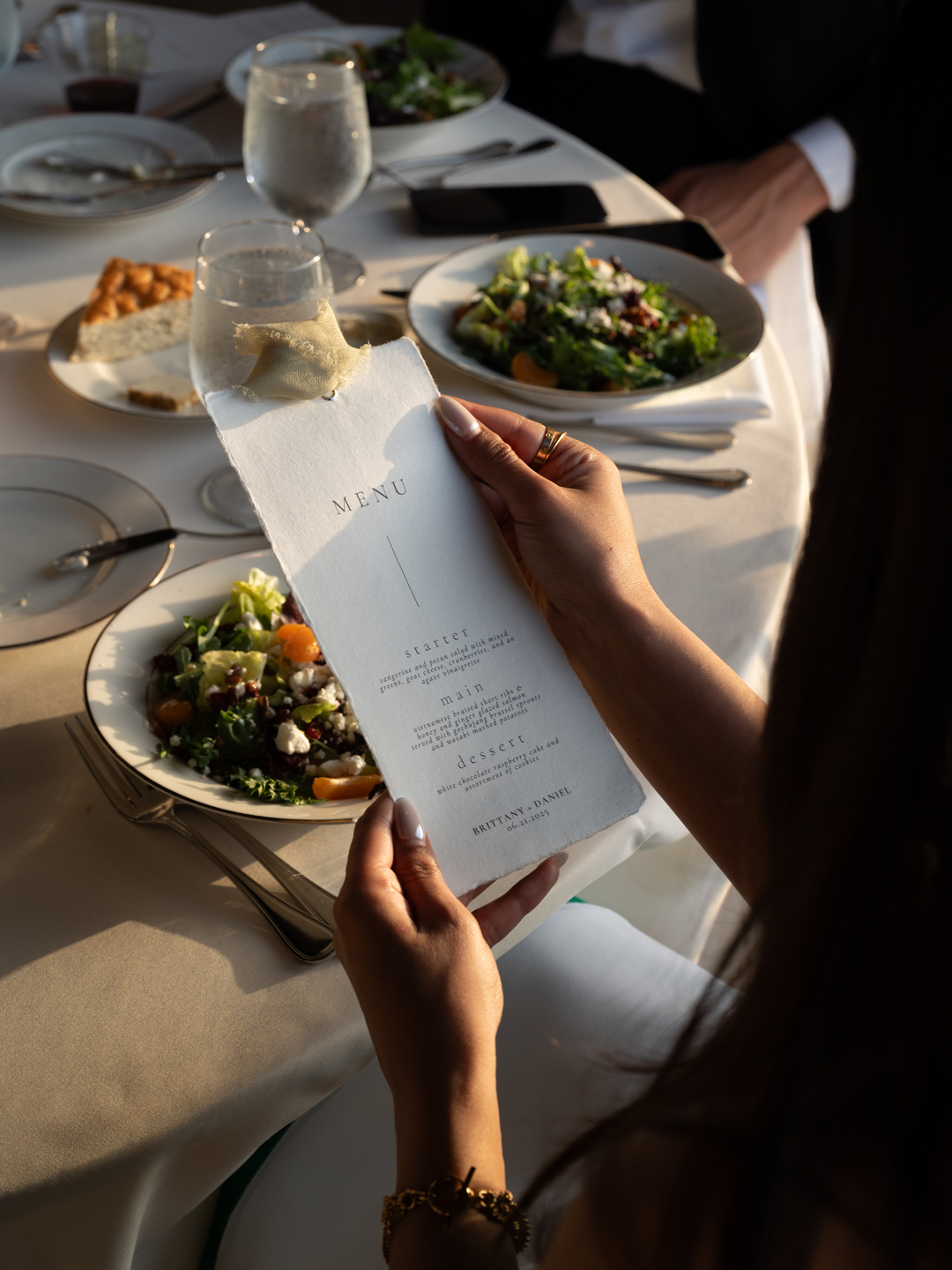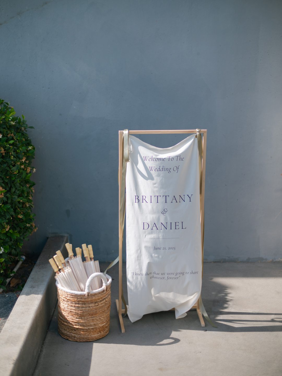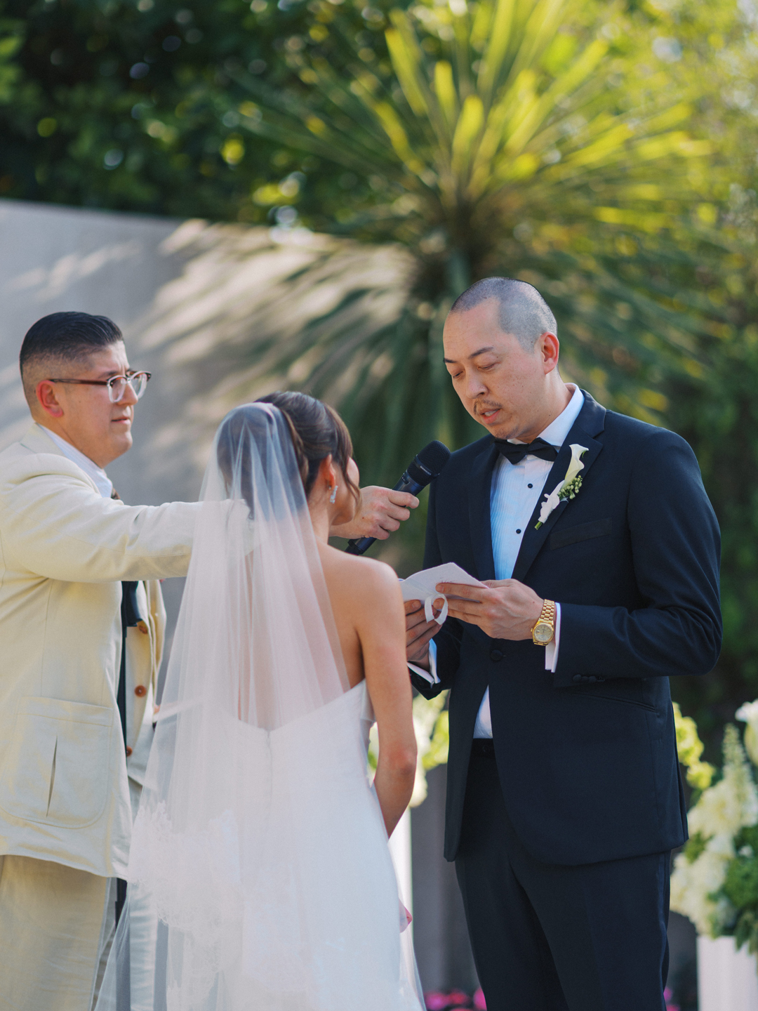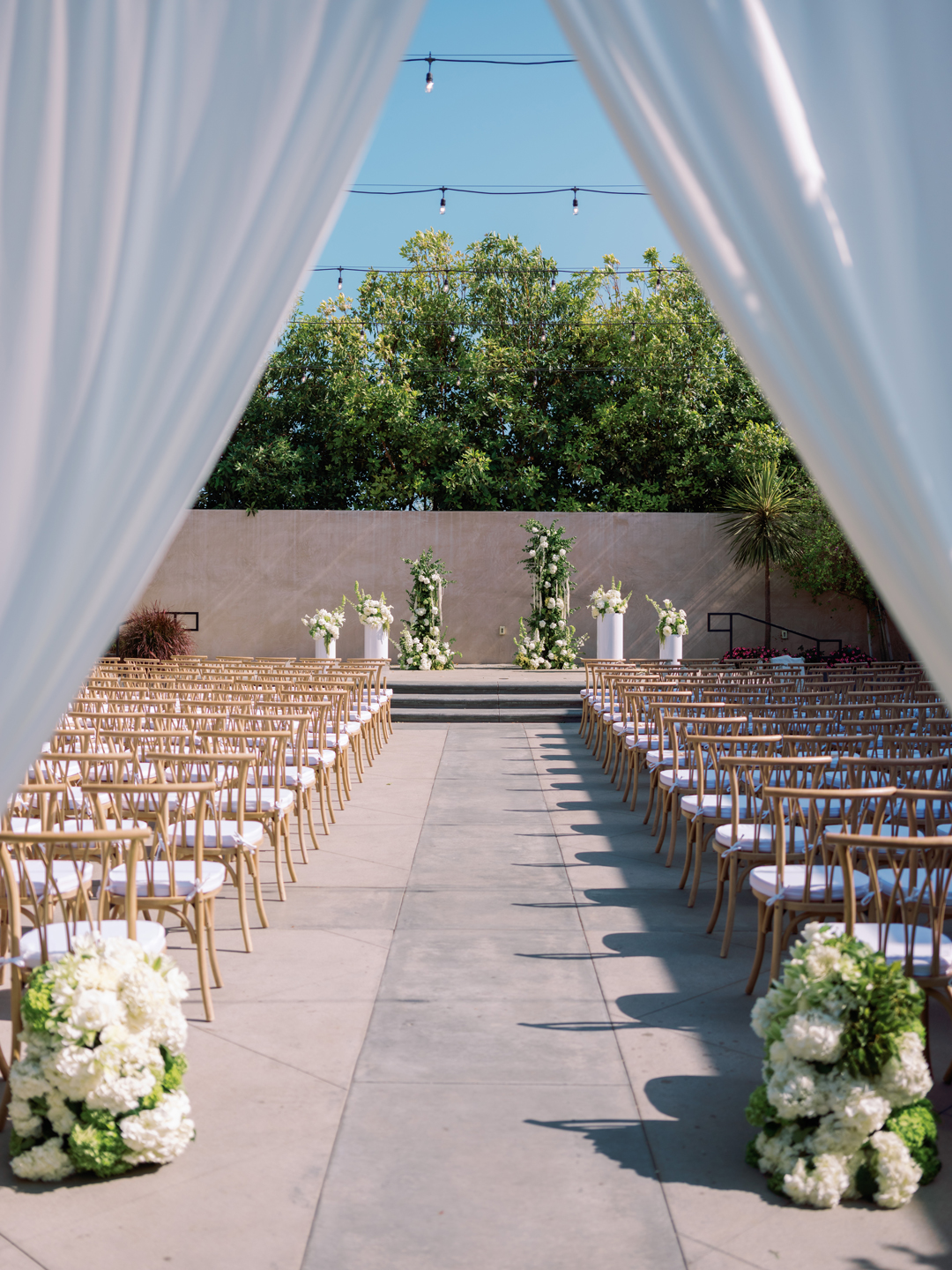 Guests entered the Hangar 21 South side patio, signed Brittany and Daniel’s guest book, then took a seat in wooden chairs. White floral and greenery pillars stood tall on the stage framed in by white pedestals topped with matching arrangements. White drapery at the back of the aisle separated the guests from the wedding party for a grand reveal, and even more green and white florals decorated the space. Once everyone was in attendance, the music cued up and the wedding party made their entrances down the aisle ending with Brittany. In front of all their family and friends, the bride and groom read handwritten vows, exchanged rings, and sealed the ceremony with a kiss.