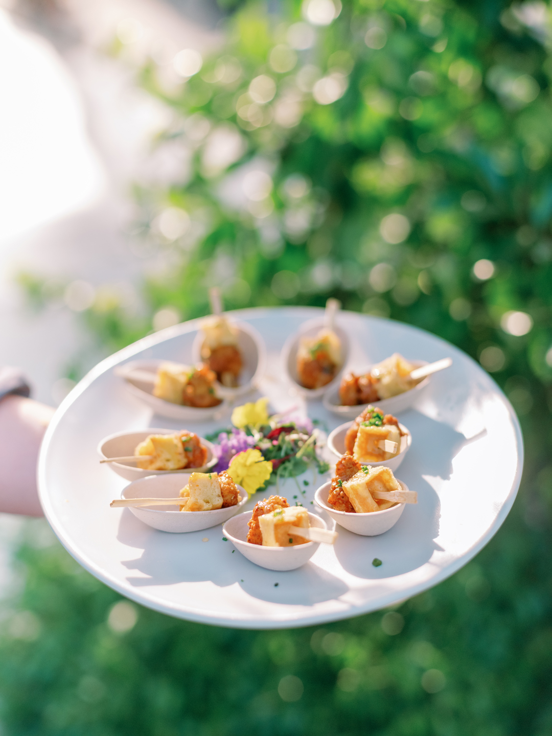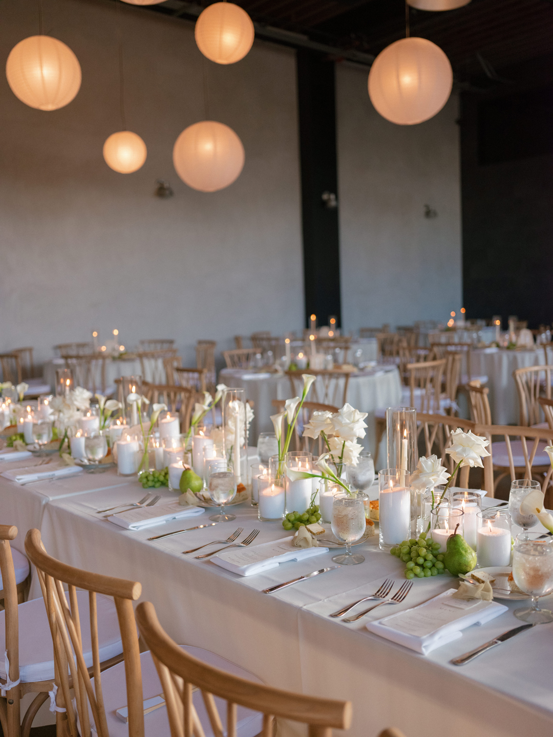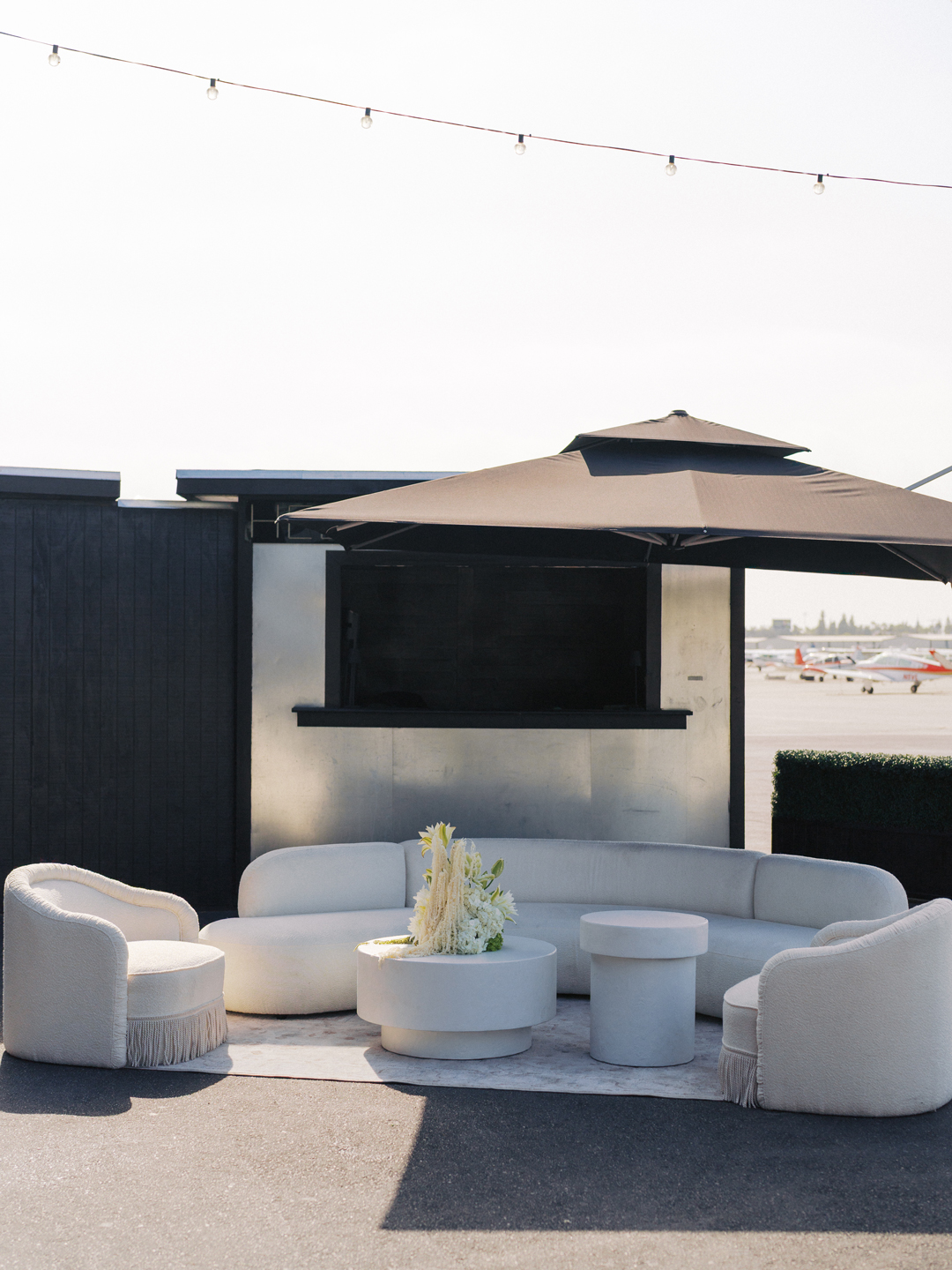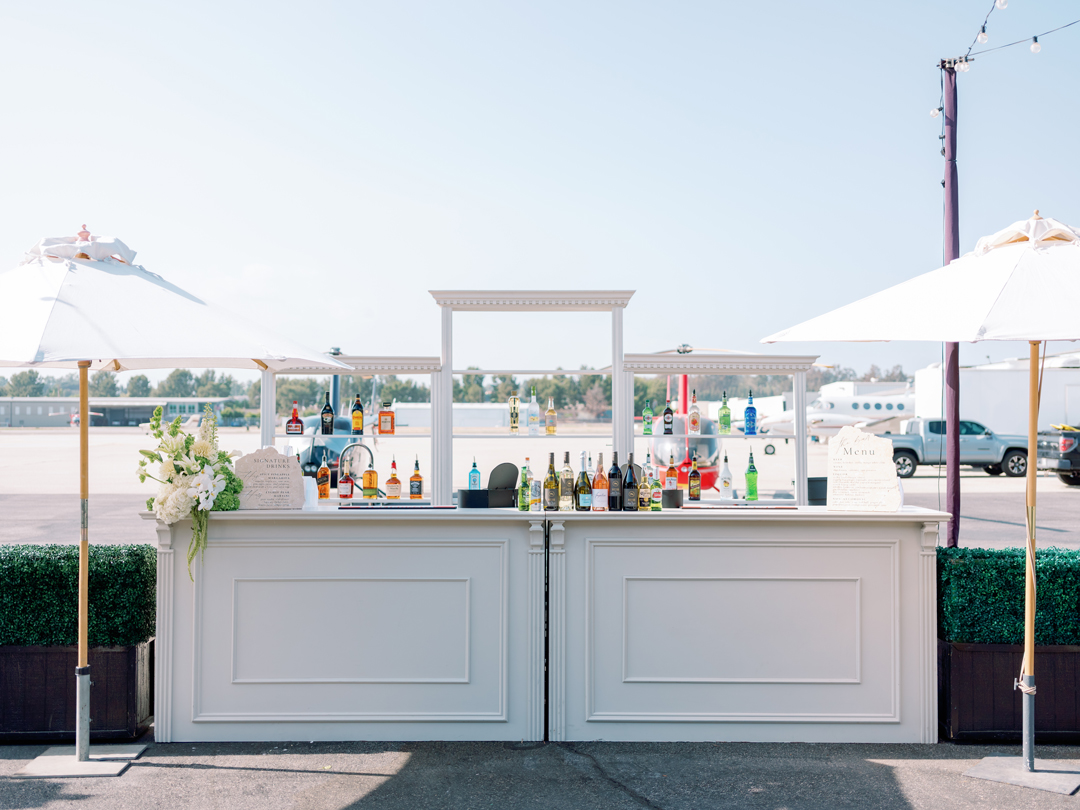 Crab Cakes, Fried Chicken and Waffle Bites, and Filet and Wild Mushroom Wellingtons were tray passed around the tarmac while the bar served up Pineapple Margarita and Lychee Pear Martini signature drinks. White roses topped cocktail tables, and a modern white lounge offered a comfortable and stylish place for guests to sit back. While everyone mixed and mingled, the newlyweds enjoyed a helicopter flight over Orange County touching down just in time for the reception.