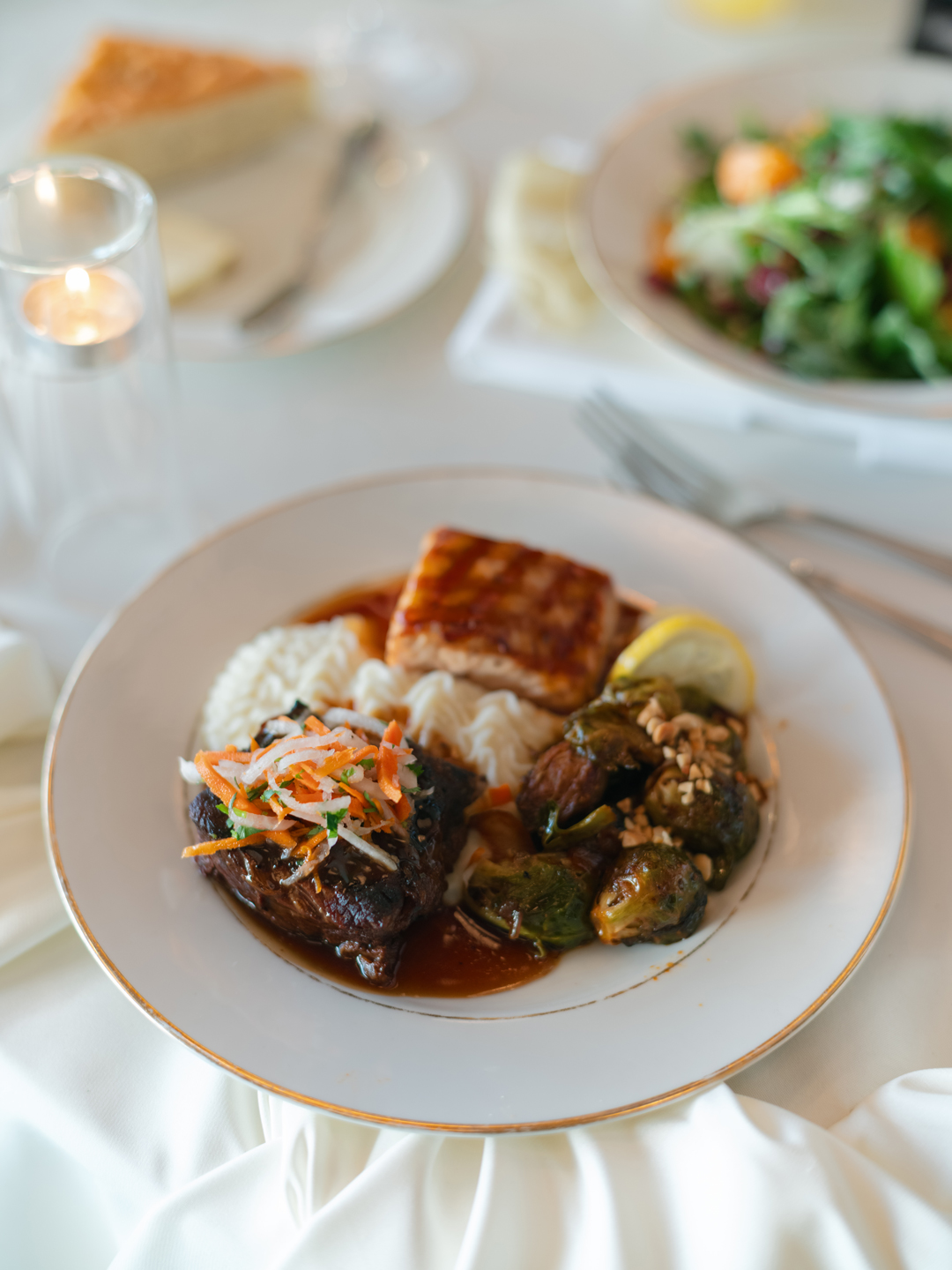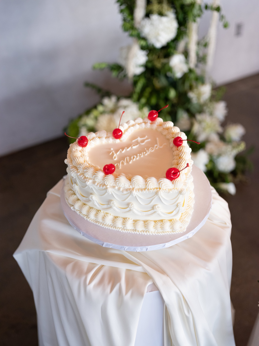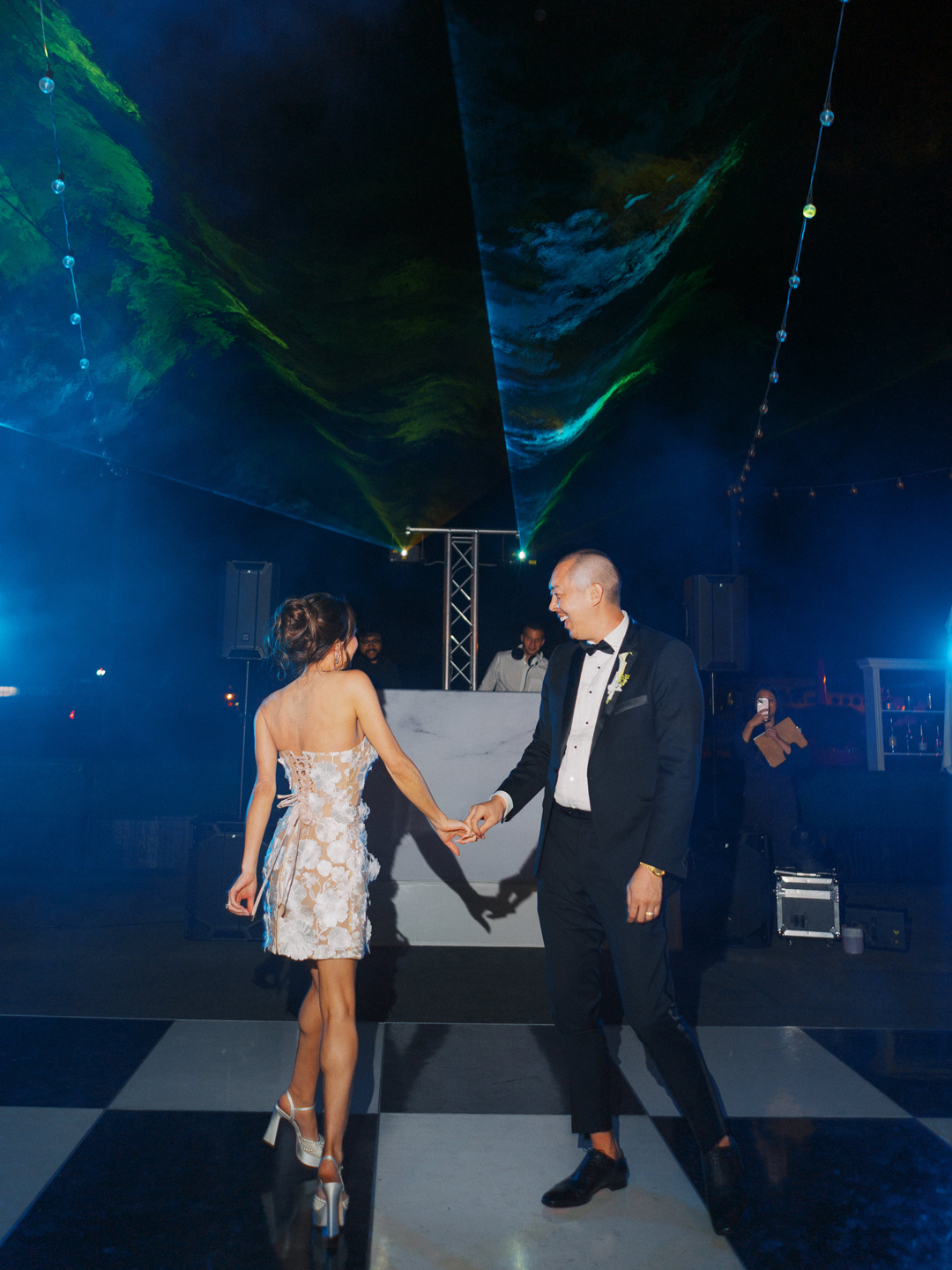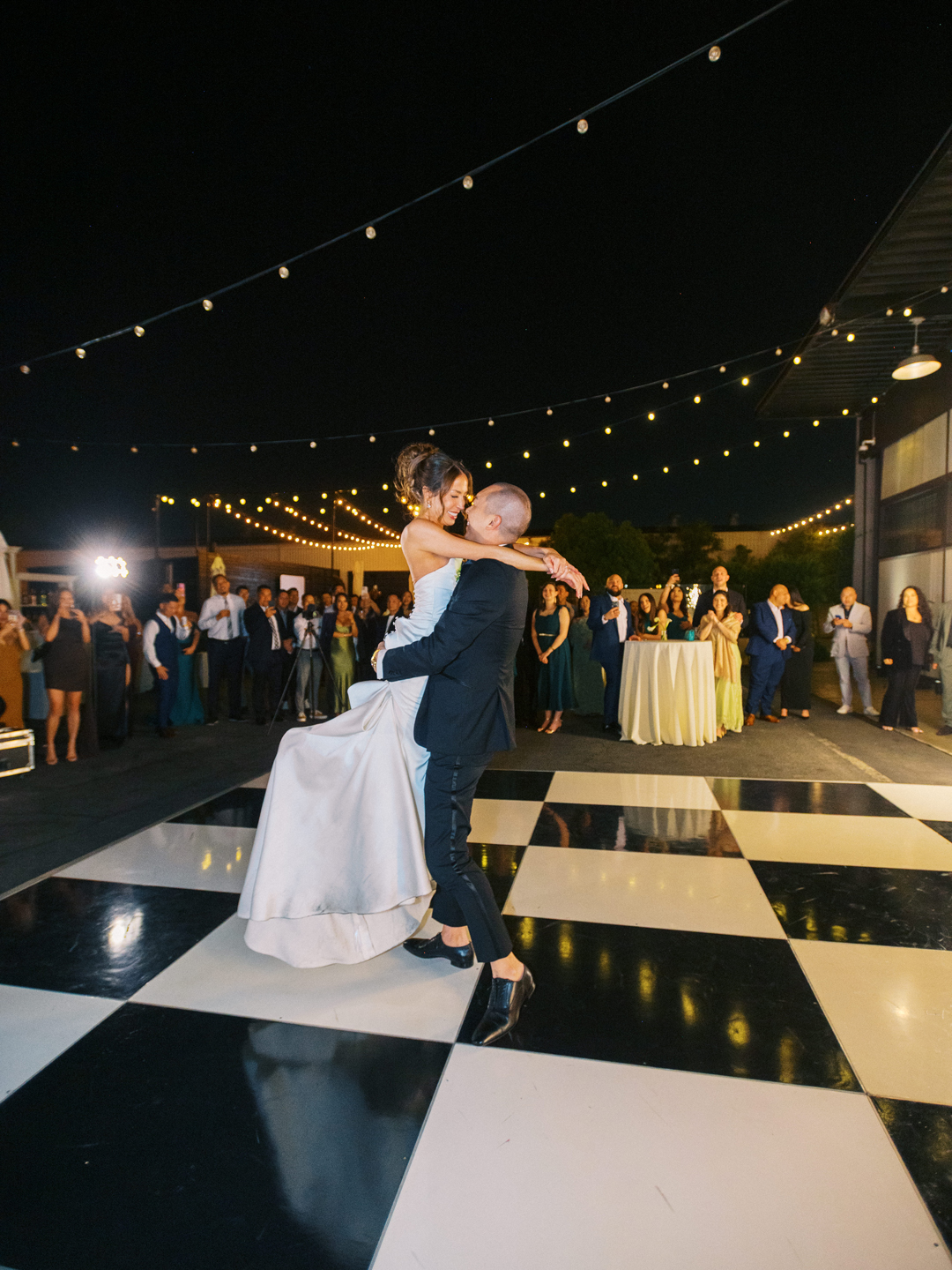 Inside the hangar, washi paper pendant lights hung from the ceiling above tables topped with green grapes and pears, white roses and calla lilies, white candles, travertine table numbers, and printed menus. Everyone got up from their seats and filmed Brittany and Daniel’s grand helicopter entrance into the reception. Guests toasted with their drinks while the bride and groom popped champagne and poured it into their champagne tower before taking a seat at their sweetheart table. Tangerine and Pecan Salad followed by Vietnamese Braised Short Ribs and Honey and Ginger Glazed Salmon with Gochujang Brussels Sprouts and Wasabi Mashed Potatoes was served. The dinner menu was selected by the bride and groom with help from our event specialist, Arielle. After dinner, the newlyweds shared their first dance out on the black and white checkered dance floor, then opened it up to everyone! One outfit change and a lot of dancing later, Daniel and Brittany cut into our Vintage Heart Cake and invited their guests to indulge in a slice for dessert along with cookies from our Old Fashioned Cookie Assortment. The evening ended with everyone out on the dance floor showing off their best moves and wishing the bride and groom well.