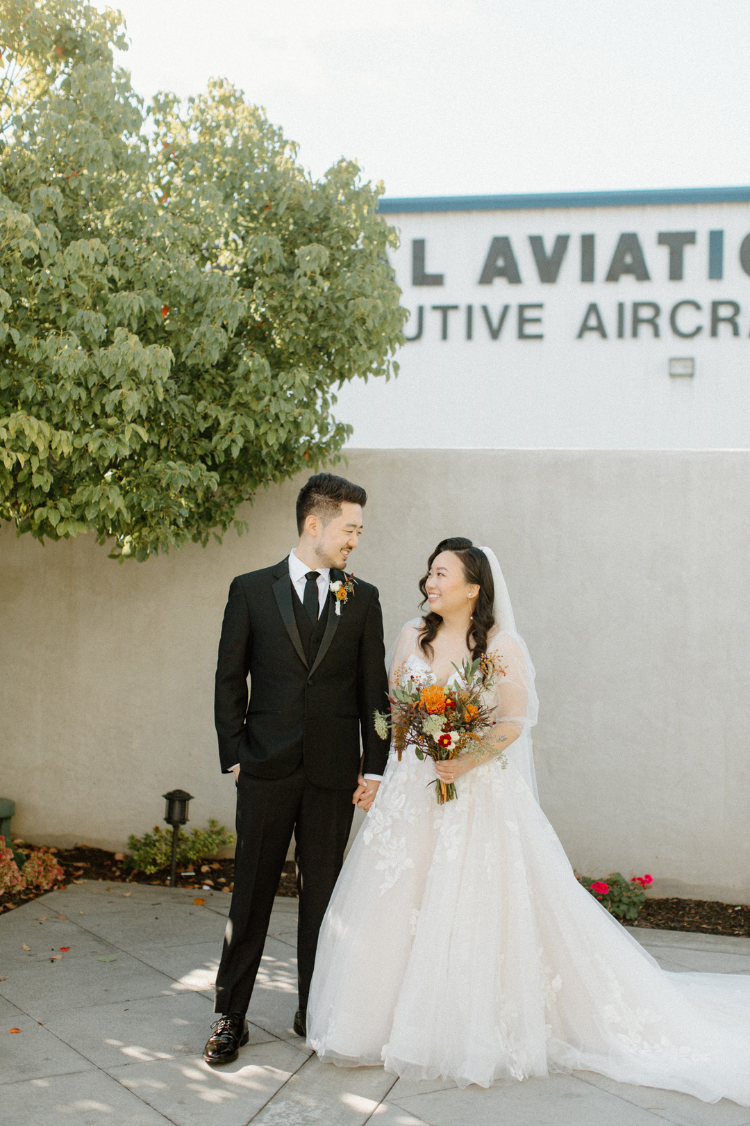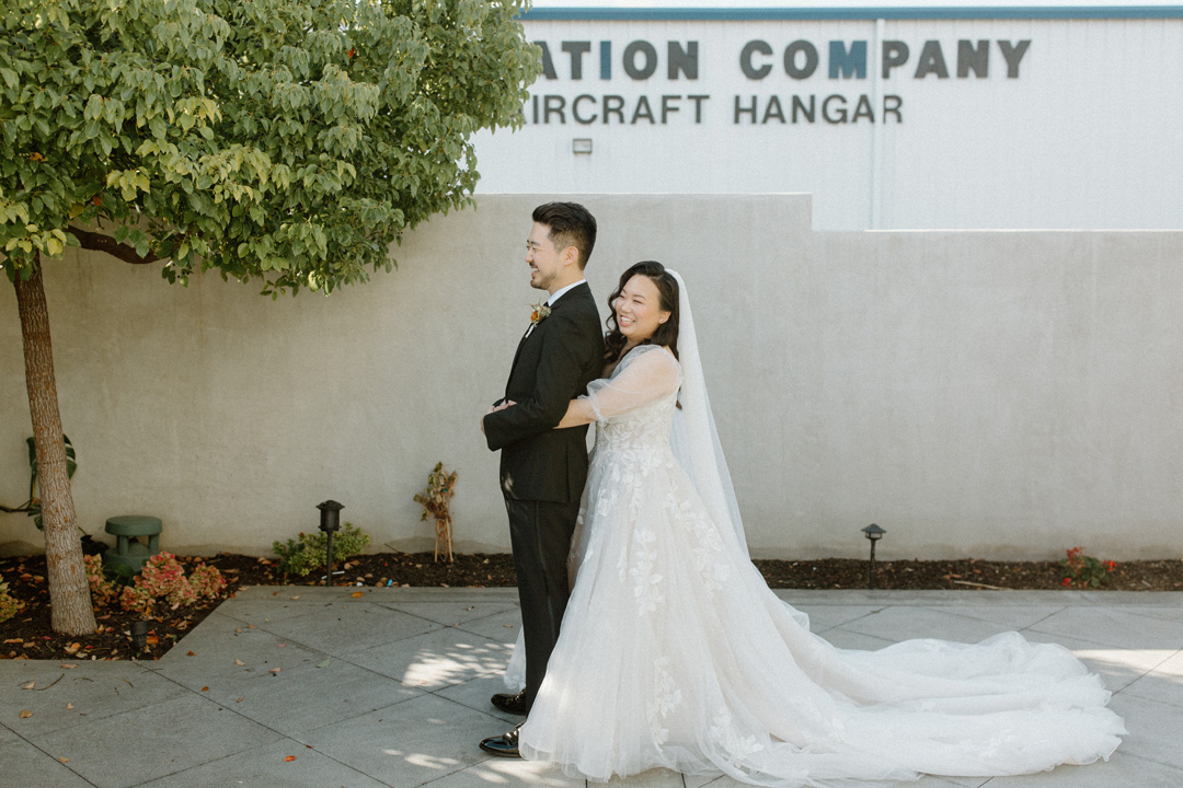 Viviann slipped on her shoes and James suited up, then the couple met outside Hangar 21 South for their first look. A hug and tap on the shoulder turned James around to see his beautiful bride standing before him in a tulle and lace wedding gown. The bride and groom exchanged sweet compliments, then joined their wedding party on the tarmac for group photos before lining up for ceremony.