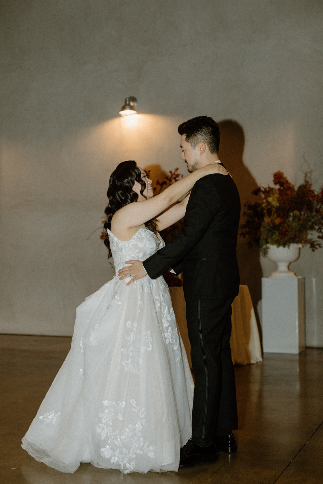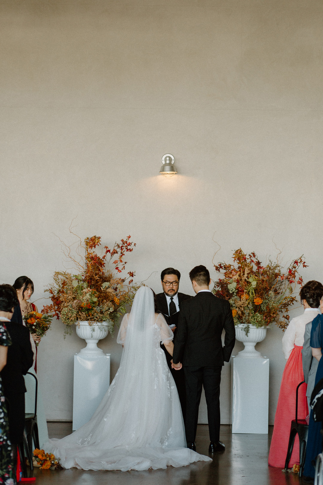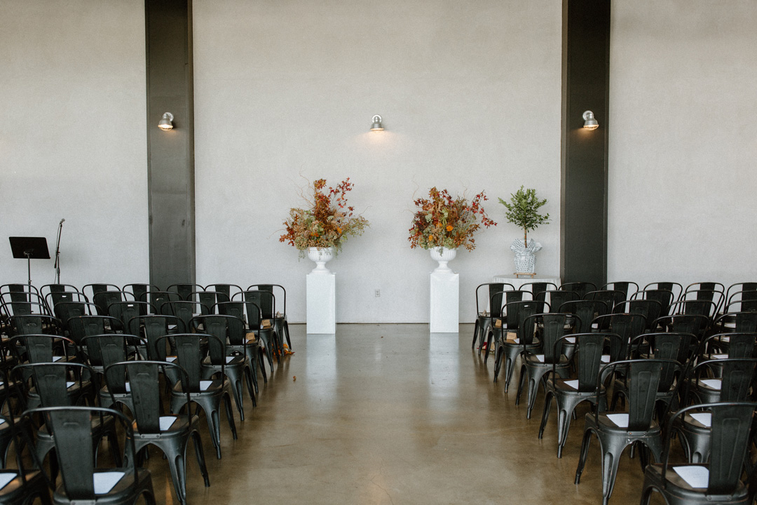 Guests entered Hangar 21 South, signed James and Viviann’s guest book, then took a seat inside the hangar. White pillars topped with fall-colored florals decorated the ceremony backdrop. Once everyone was seated, the wedding party made their entrances ending with Viviann. In front of all their closest friends and family, James and Viviann read personalized vows, exchanged rings, watered their unity tree, and sealed the ceremony with a kiss.