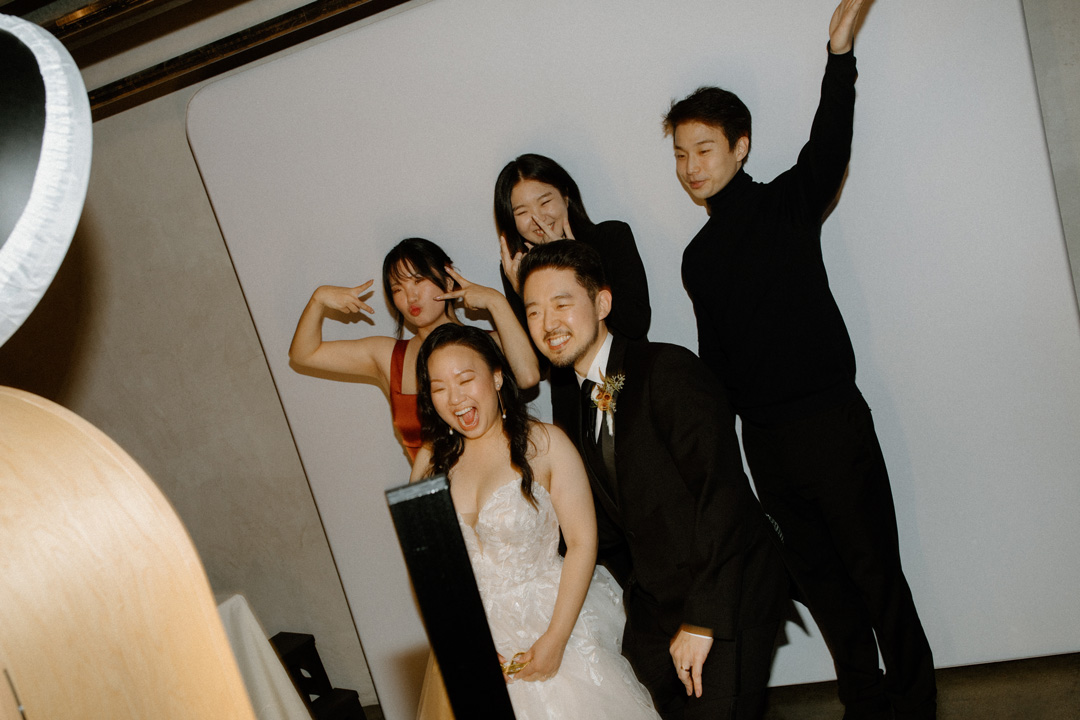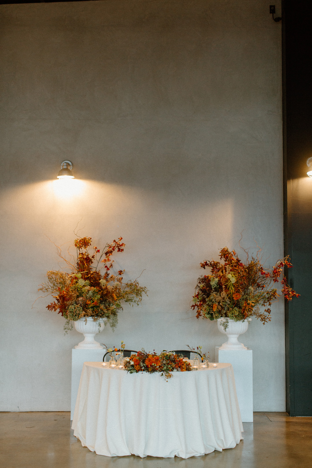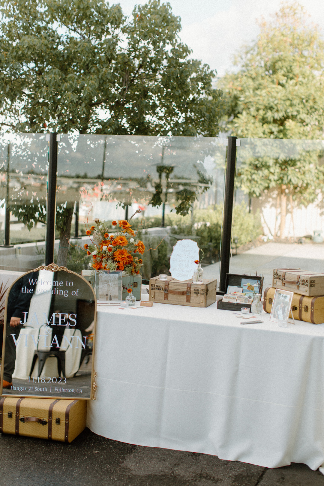 Guests entered Hangar 21 South, signed James and Viviann’s guest book, then took a seat inside the hangar. White pillars topped with fall-colored florals decorated the ceremony backdrop. Once everyone was seated, the wedding party made their entrances ending with Viviann. In front of all their closest friends and family, James and Viviann read personalized vows, exchanged rings, watered their unity tree, and sealed the ceremony with a kiss.