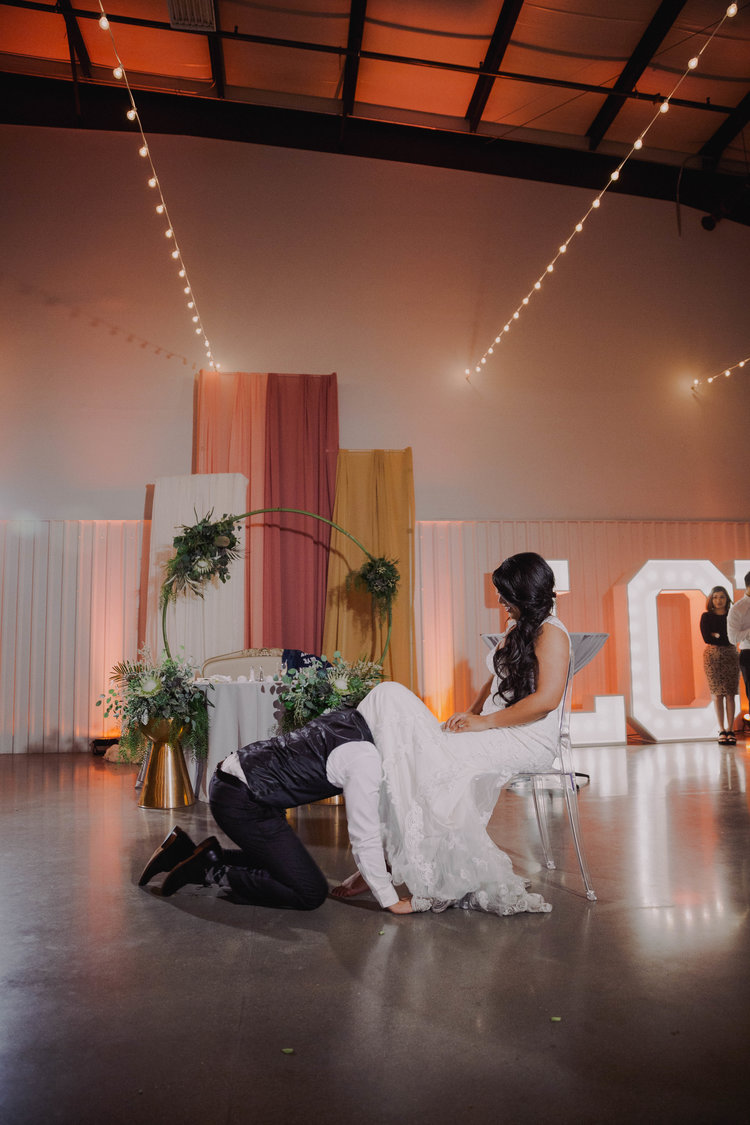 Jarryd and Kirstie’s June wedding captured the romance of a tropical summer night with a color palette that rivaled the melting colors of a sunset- with green floral accents.