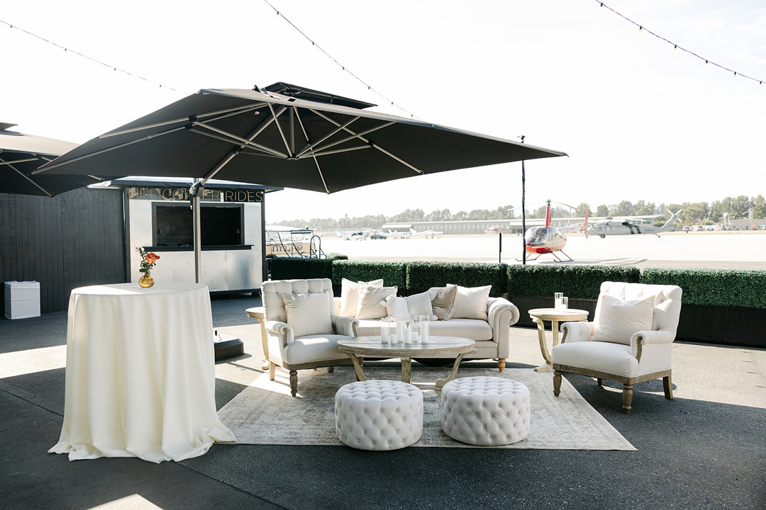 Filet and Wild Mushroom Wellingtons, Seared Ahi on Wonton Chips, and Fig, Goat Cheese and Mascarpone Tarts were tray passed around the tarmac while the bar served up Aperol Spritz and Pineapple Margarita signature drinks. White and taupe-colored lounges were situated on either side of the tarmac for guests to sit back and relax while watching small planes take off and land. Everyone mixed and mingled until it was time to head into the hangar for the reception.