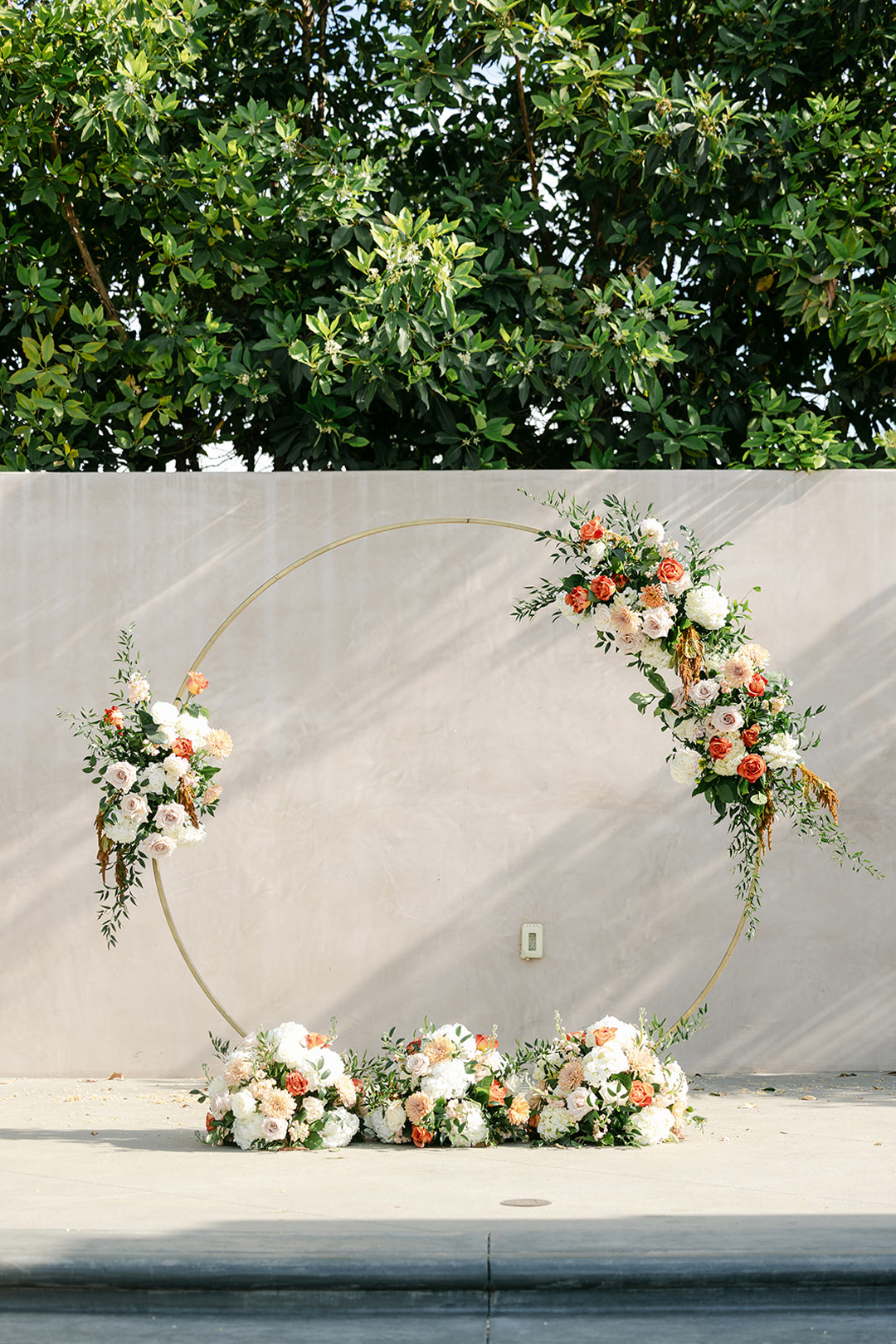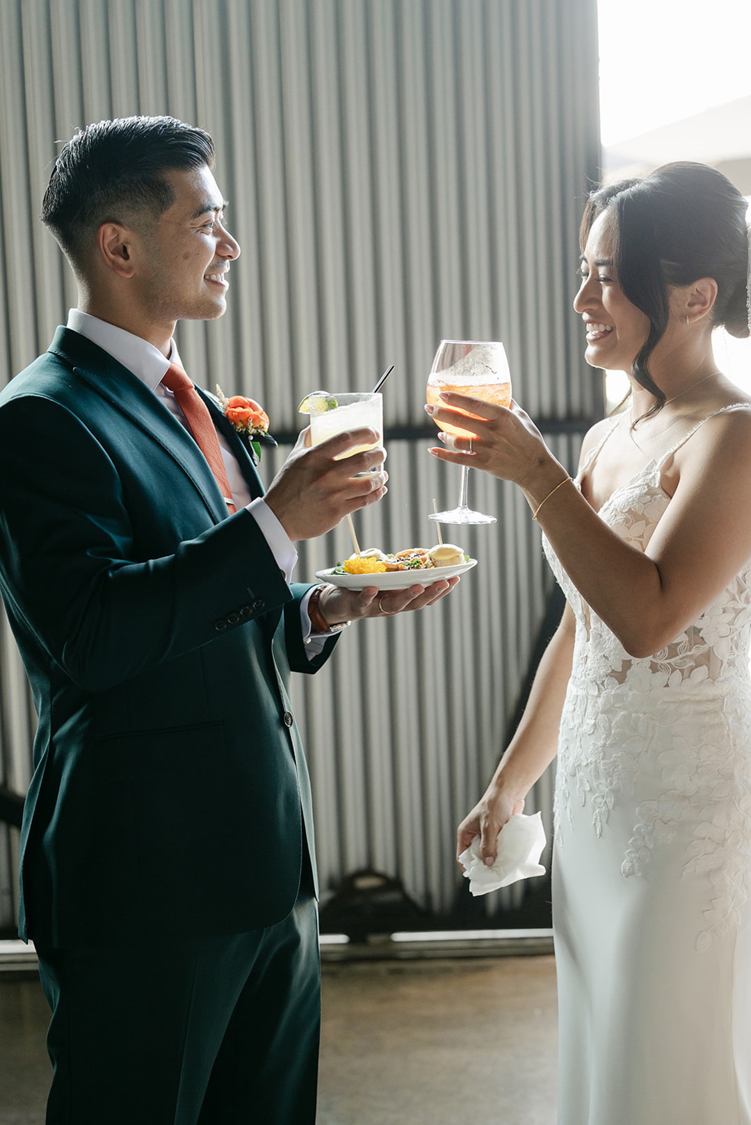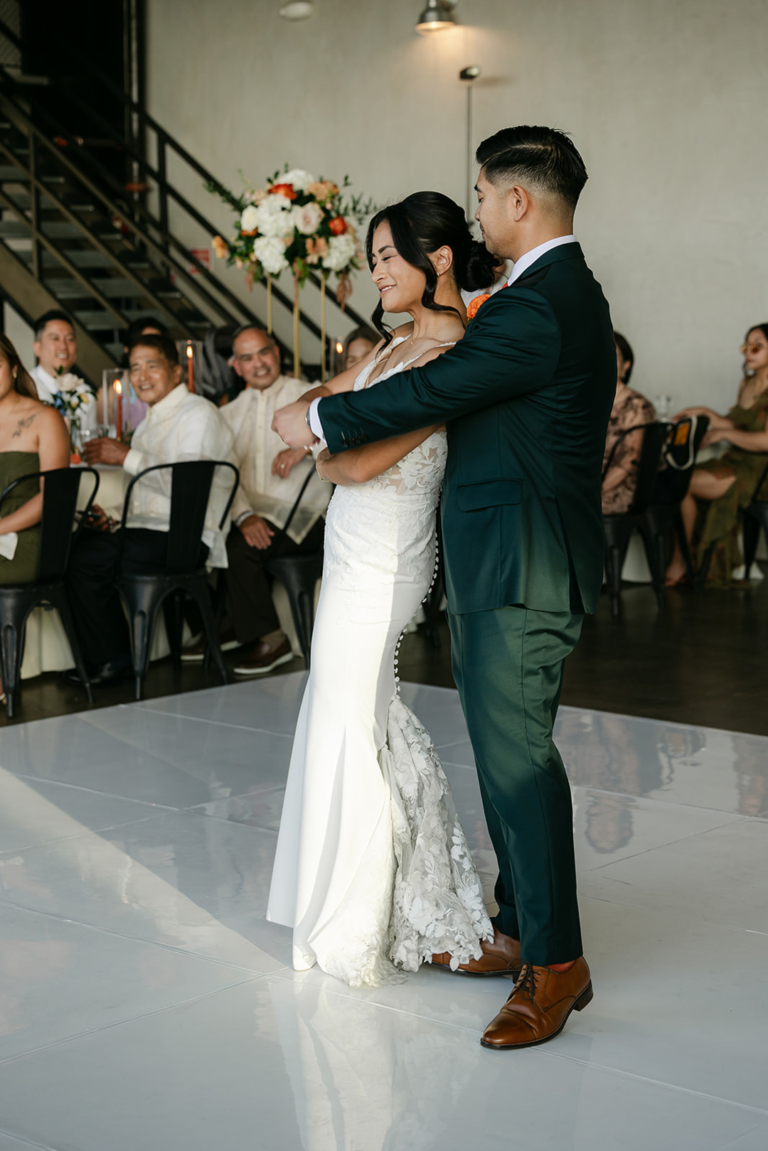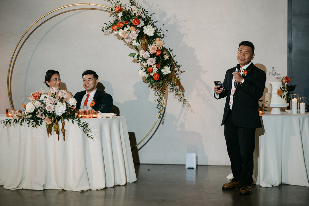 Guests entered the side patio, signed the bride and groom’s guest book, then took a seat. Orange, blush, and white flowers lined the aisle and decorated the stage. Once everyone was in attendance, the music cued up and the wedding party made their entrances. In front of all their closest friends and family, Katrina and Francis shared their vows, exchanged rings, and sealed the ceremony with a kiss.