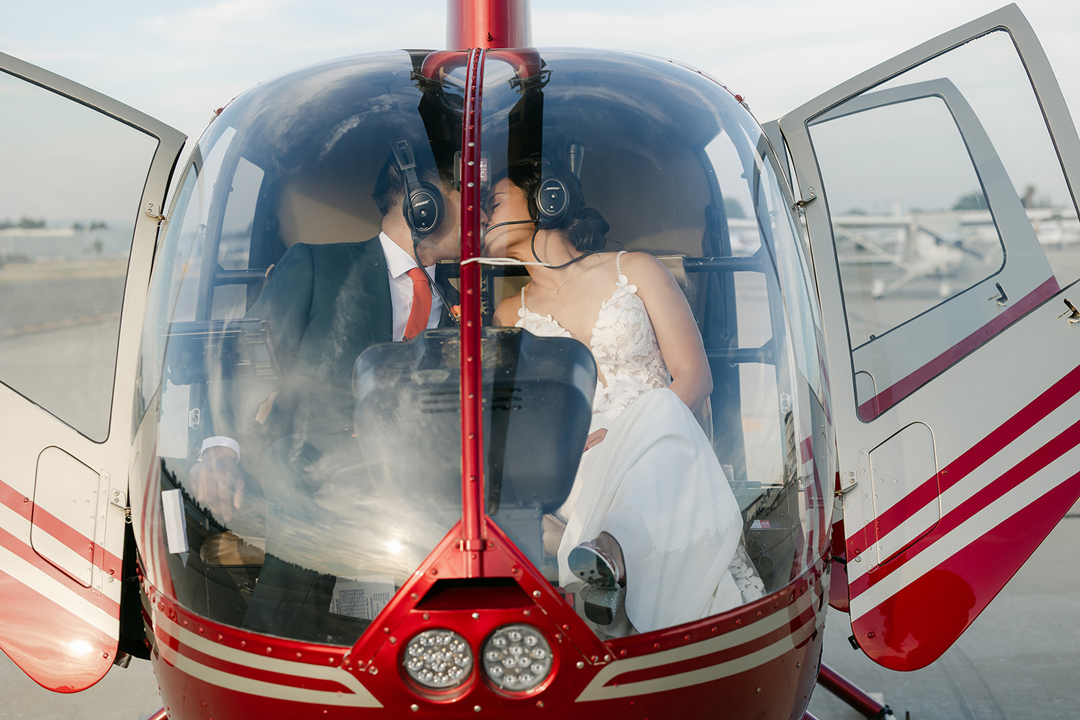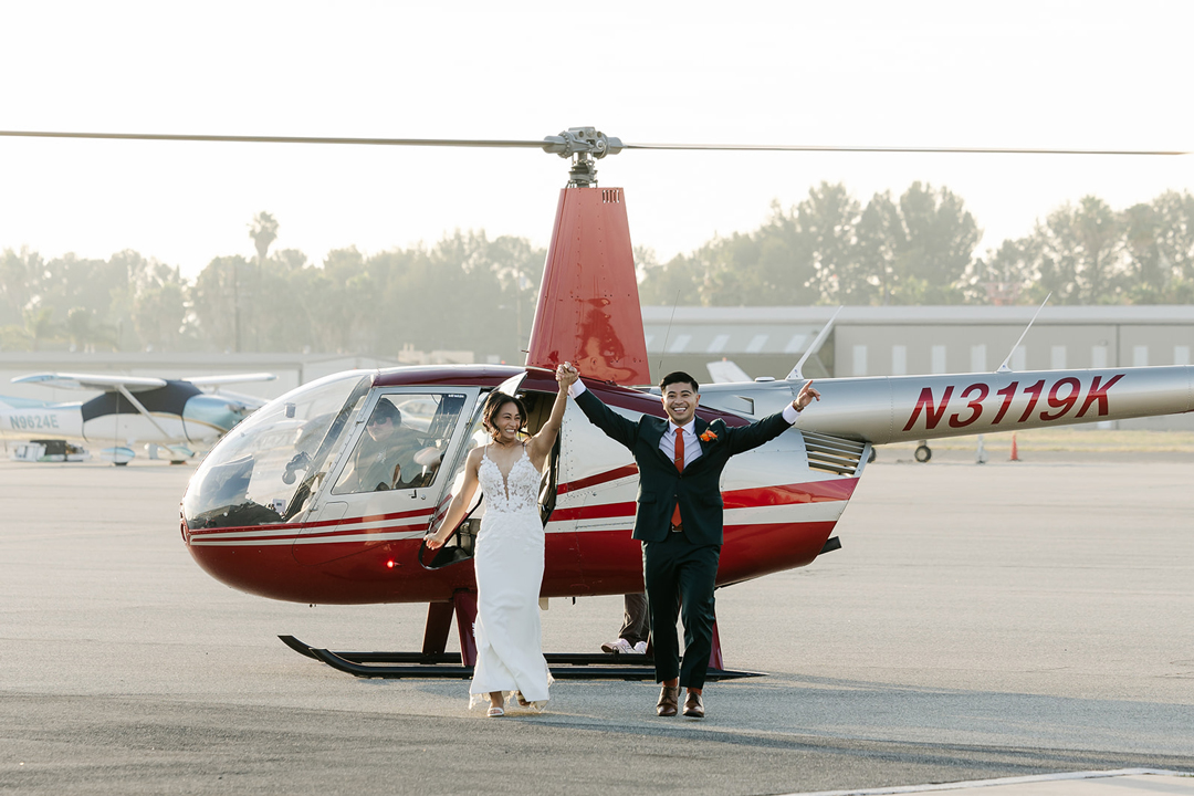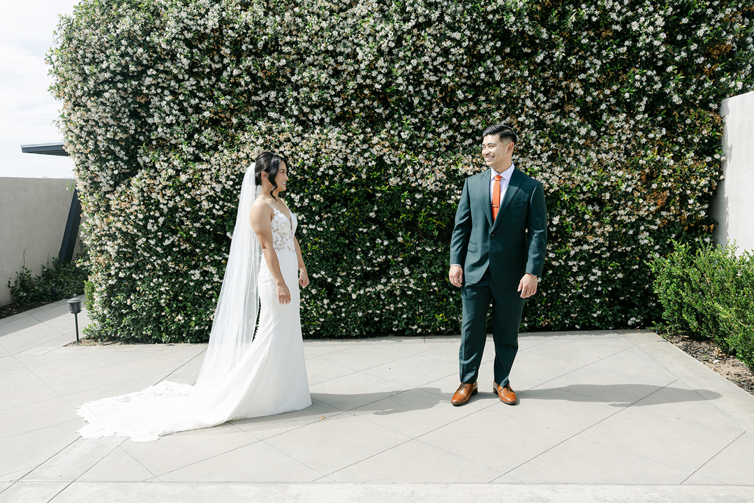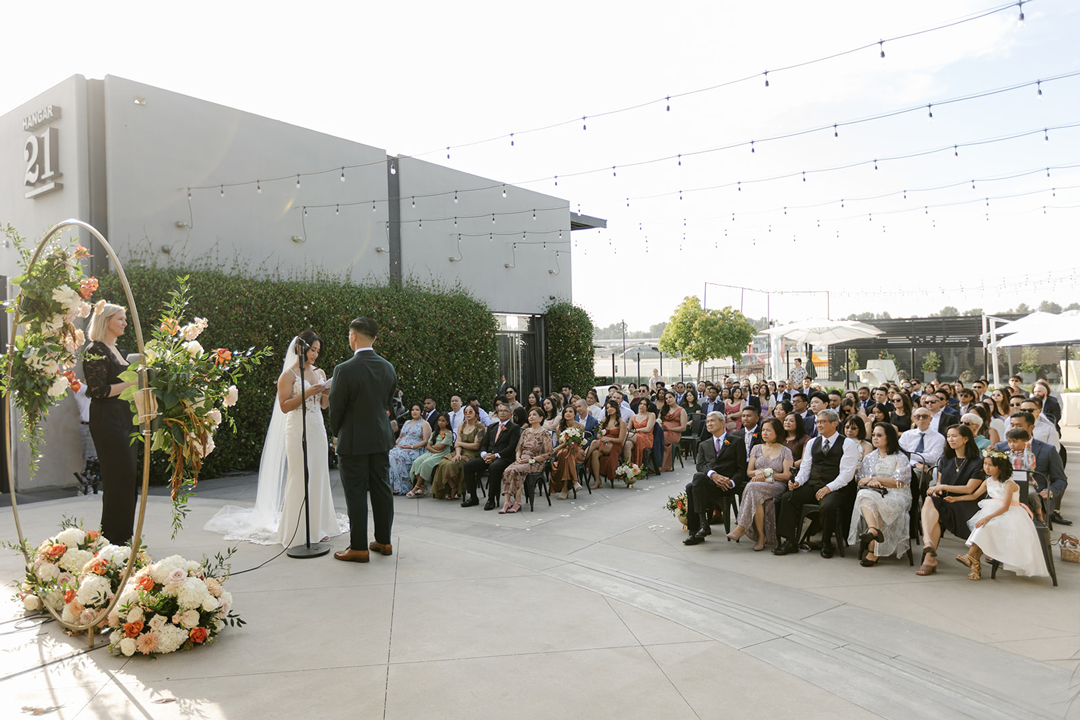 Katrina met Francis outside of Hangar 21 for their first look. On the photographer’s signal, Francis turned around to see his beautiful bride standing before him in a lace detail wedding dress and smiles immediately filled their faces. Sweet compliments were exchanged, then the couple joined their wedding party on the tarmac for group pictures. The bridesmaids were dressed in peach, orange, and tan, and the groomsmen wore black. Together the friends smiled for the camera creating lasting memories, then lined up for the ceremony.