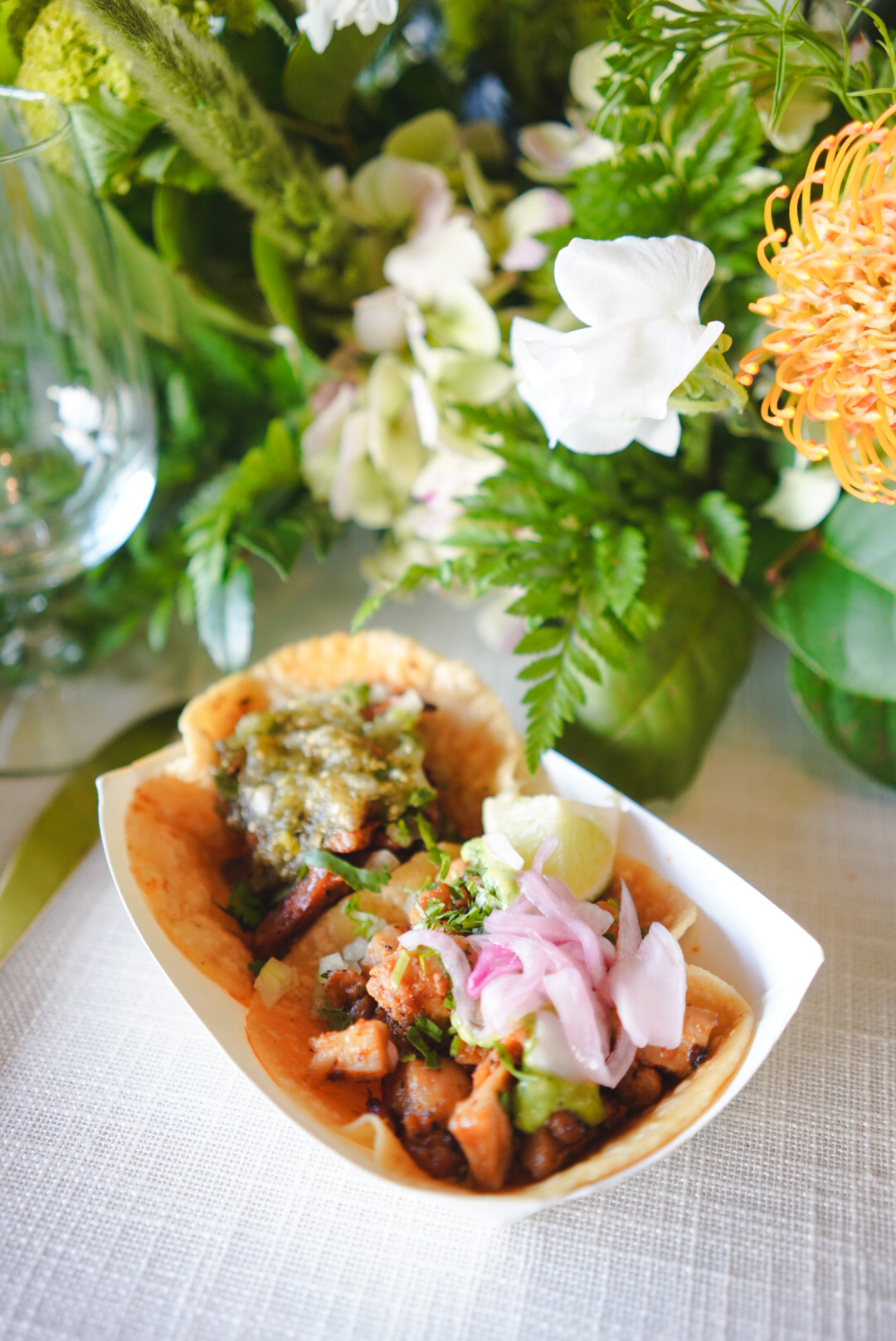 Food stations were set, and wedding vignettes were sprinkled across the venue creating a beautiful ambiance for the Taste of Jay’s at Hangar 21 South. Angie and her team from Beloved Events Co. pulled together an all-star team of vendors to help bring the tasting to life: Salt and Paper Co. for stationery and signage, Circa Rentals for specialty furnishings, Beautifully Redeemed for hair and makeup, Never Cloudy Events provided a fun photo booth for guests to enjoy, Second Song provided his talents on the mixer, and Kenny Wong on the camera to capture it all. Ceremony was set in the side patio where our Event Specialists greeted clients as they entered the event. A wooden backdrop decorated in greenery and orange and white flowers stood tall as the focal point and two additional floral arrangements completed the space. Guests passed a boho seating display where tables and names were printed onto bottle bud vases and were greeted by a bright orange couch upon entering the tarmac. Rattan and retro-inspired accent chairs completed the lounge space and of course, Beloved Events Co. added fresh florals atop the coffee table for some fun. Inside the hangar, pops of green and orange flowers topped a sweetheart table and reception table where custom menus were placed at each table setting. Angie of Beloved Events Co., her husband, and the photographer wandered around the venue in wedding attire posing for pictures just before the tasting began, then took a seat at their vendor tables and got ready to mingle with attendees. The evening was filled with delicious food items like our Pasta Station, Filet and Wild Mushroom Wellingtons, Taco Station, Mediterranean Station, Kouign Amann desserts, and so much more.